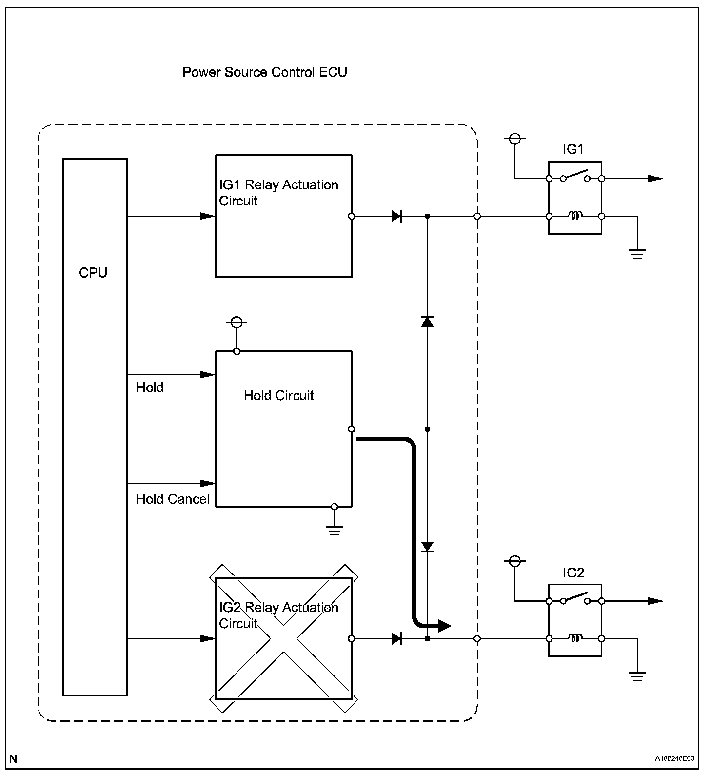 The power Source Control ECU consists of the IG1 and IG2 relay actuation circuits, CPU, and hold circuit.