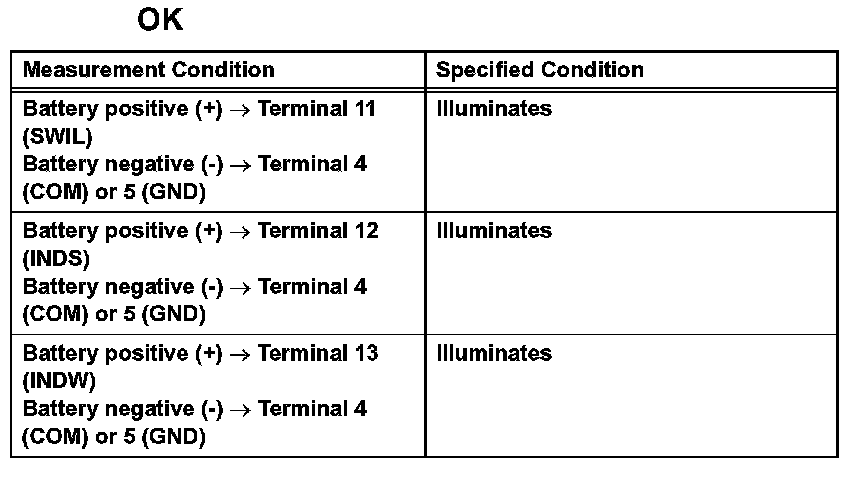 b. Apply battery voltage between the terminals of the switch, and check the illumination condition of the switch.
