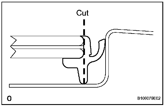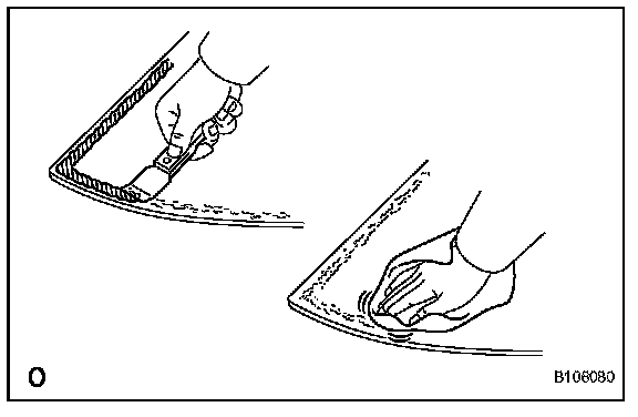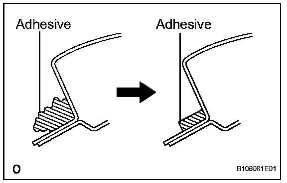 1. On the contact surface of the vehicle body, use a knife to cut away excess adhesive as shown in the illustration.
