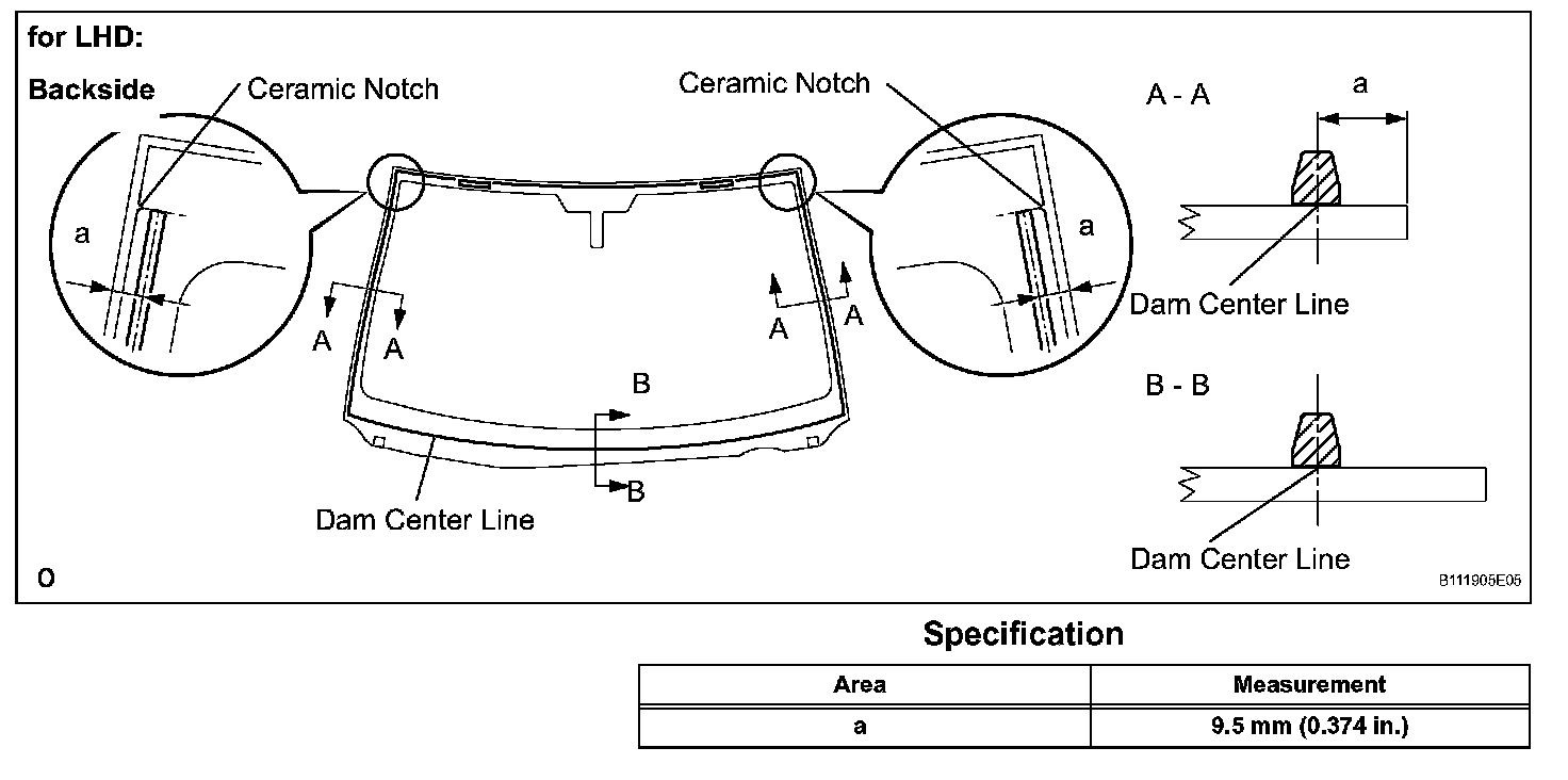 b. Remove the peeling paper from the adhesive part of the dam. Install the dam (adhesive side) to the glass (Primer G area), but exclude the area above the notches on the upper part of the glass.