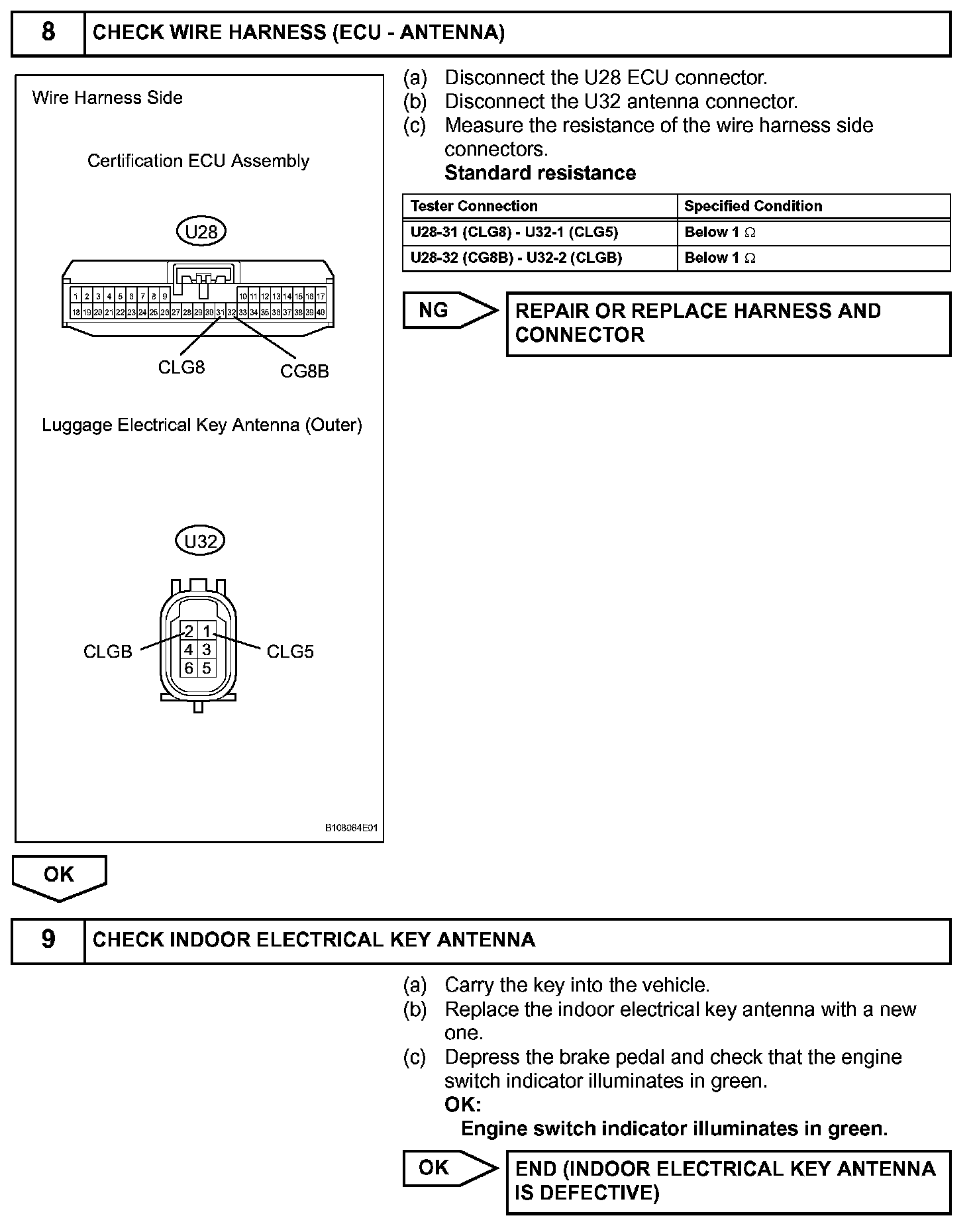 When the power luggage door open switch is turned ON, the certification ECU uses the luggage electrical key antenna (outer) and antenna to output a request signal to the outside of the vehicle for a distance of approximately 1.0 m (3.3 ft) from the luggage compartment door. A key near the luggage compartment door detects this request and transmits its ID code. The entry door control receiver receives the ID code and sends this ID code to the certification ECU. The certification ECU checks if the ID code is valid. When the ID code is valid, the certification ECU sends a luggage compartment door open signal to the cowl side junction block LH (drive side junction block ECU) using the multiplex communication line and stops outputting request signals. The luggage room junction block then unlocks the luggage compartment door.