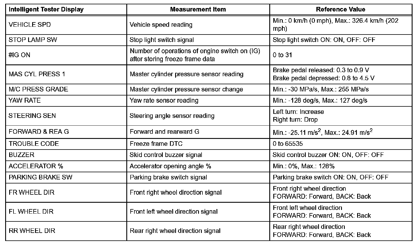 - Freeze frame data at the time a DTC is detected: When the skid control ECU stores data at the time a DTC is detected, no updates will be performed until the data is cleared.