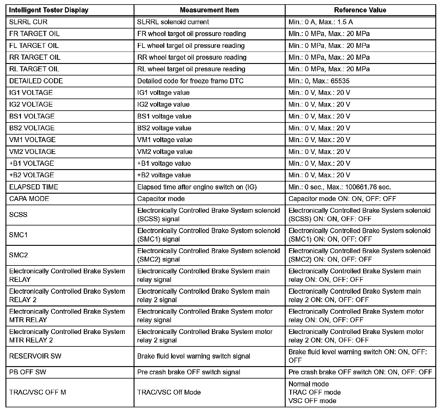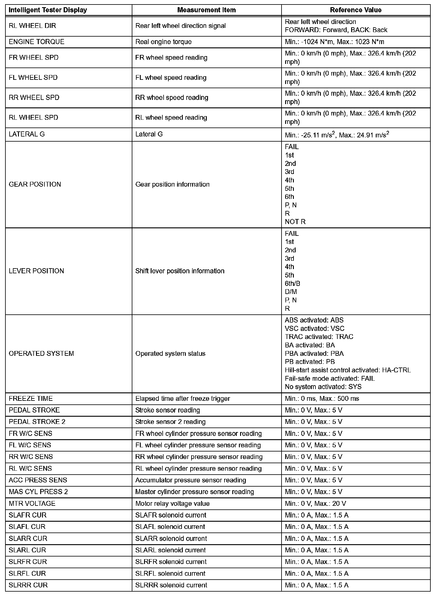 - Freeze frame data at the time the ABS, BA, TRAC or VSC operates: The skid control ECU stores and updates the data whenever the ABS, BA, TRAC or VSC system operates. When the ECU stores data at the time a DTC is detected, the data stored when the ABS, BA, TRAC or VSC operated may be erased.