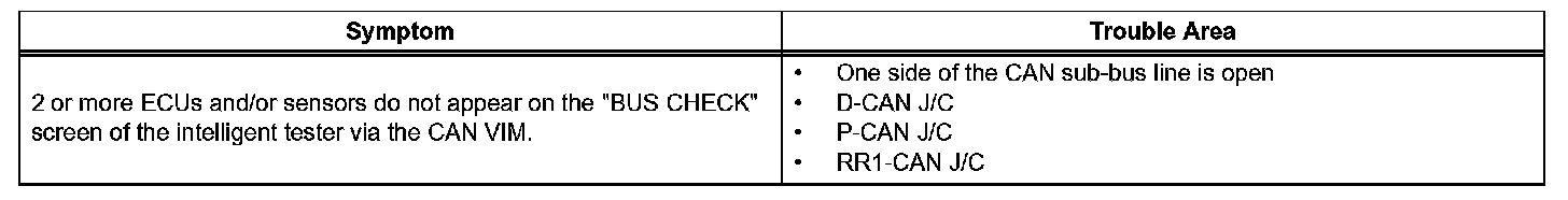 If 2 or more ECUs and/or sensors do not appear on the "BUS CHECK" screen of the intelligent tester via the CAN VIM, one side of the CAN sub-bus line may be open. (One side of the CAN-H [sub-bus line] / CAN-L [sub-bus line] of the ECU and/or sensor is open.)