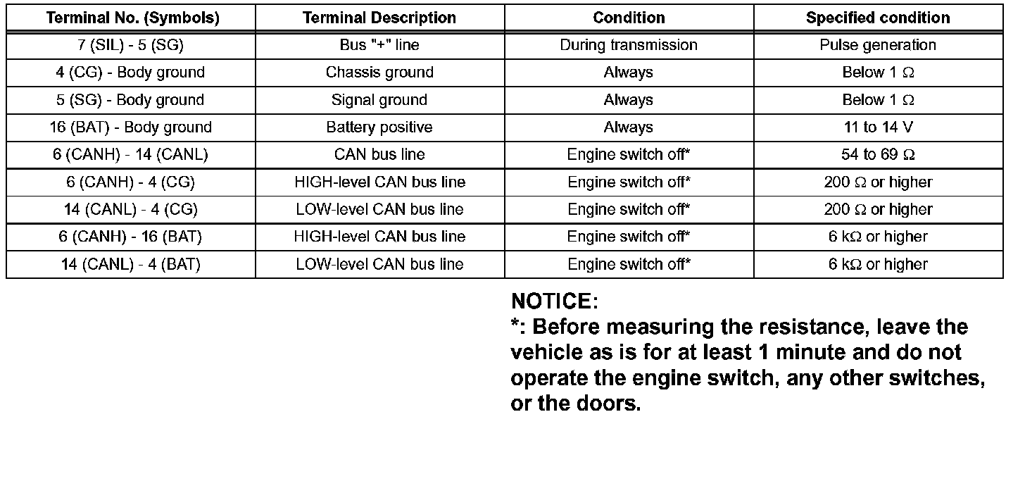 If the result is not as specified, the DLC3 may have a malfunction. Repair or replace the harness and connector.
