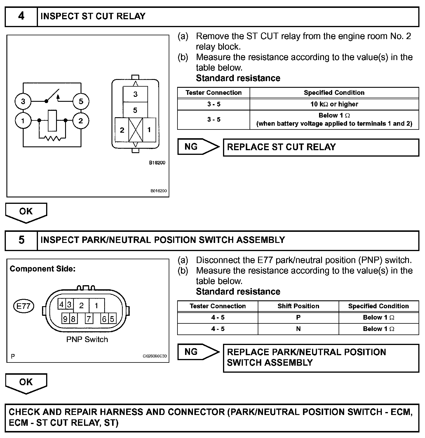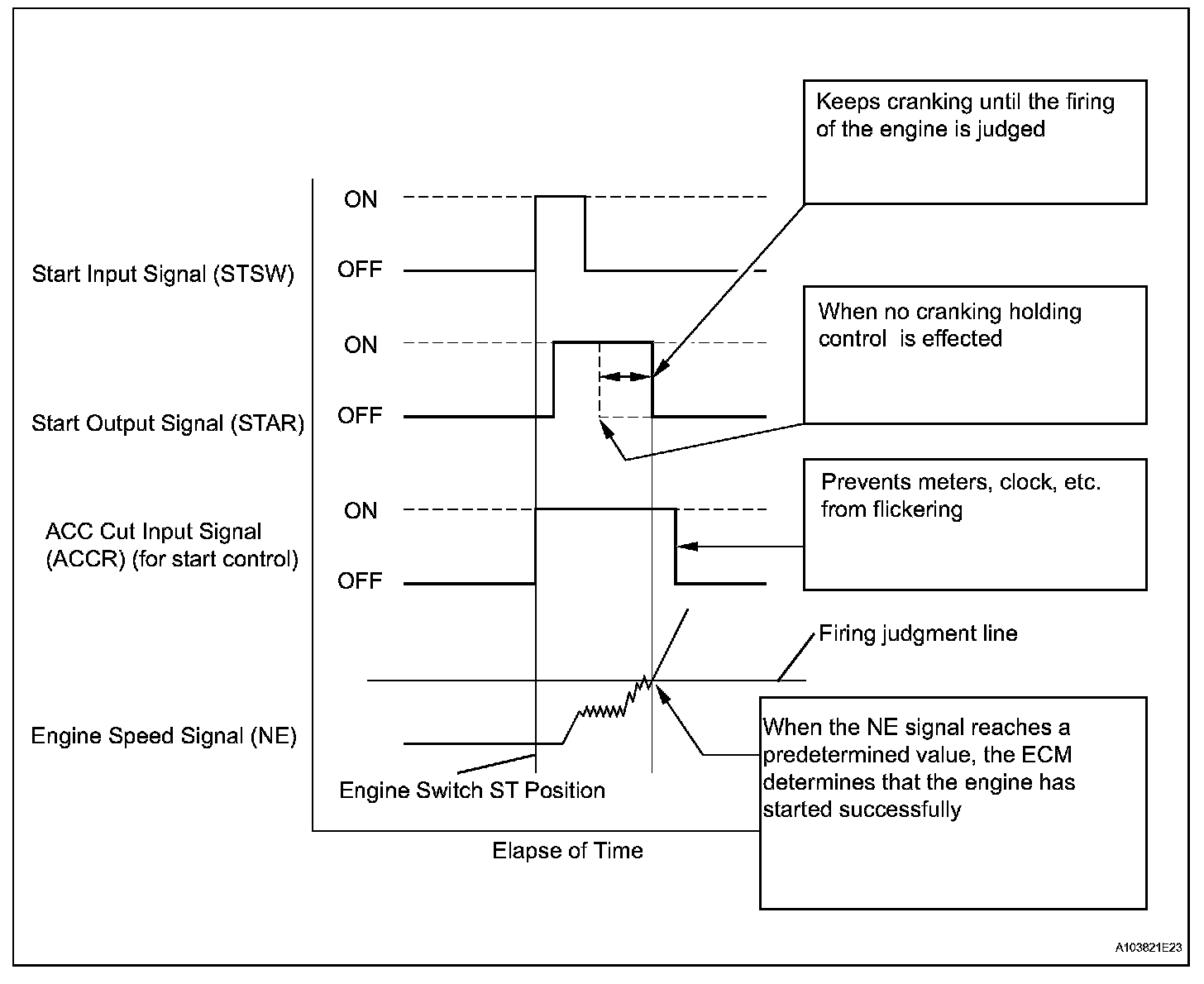 The cranking holding control system provides current to the starter when the ECM detects the engine switch's start signal (STSW). When the ECM performs a firing judgment, the system cuts current to the starter. When the ECM receives the STSW signal, it turns on the ST CUT relay, which prevents flickering of the combination meter, clock, audio system, etc. Also, the ECM sends a signal to the ECM's STAR terminal. Then the STAR output signal travels through the park/neutral position (PNP) switch to the STARTER relay, causing the starter to activate.