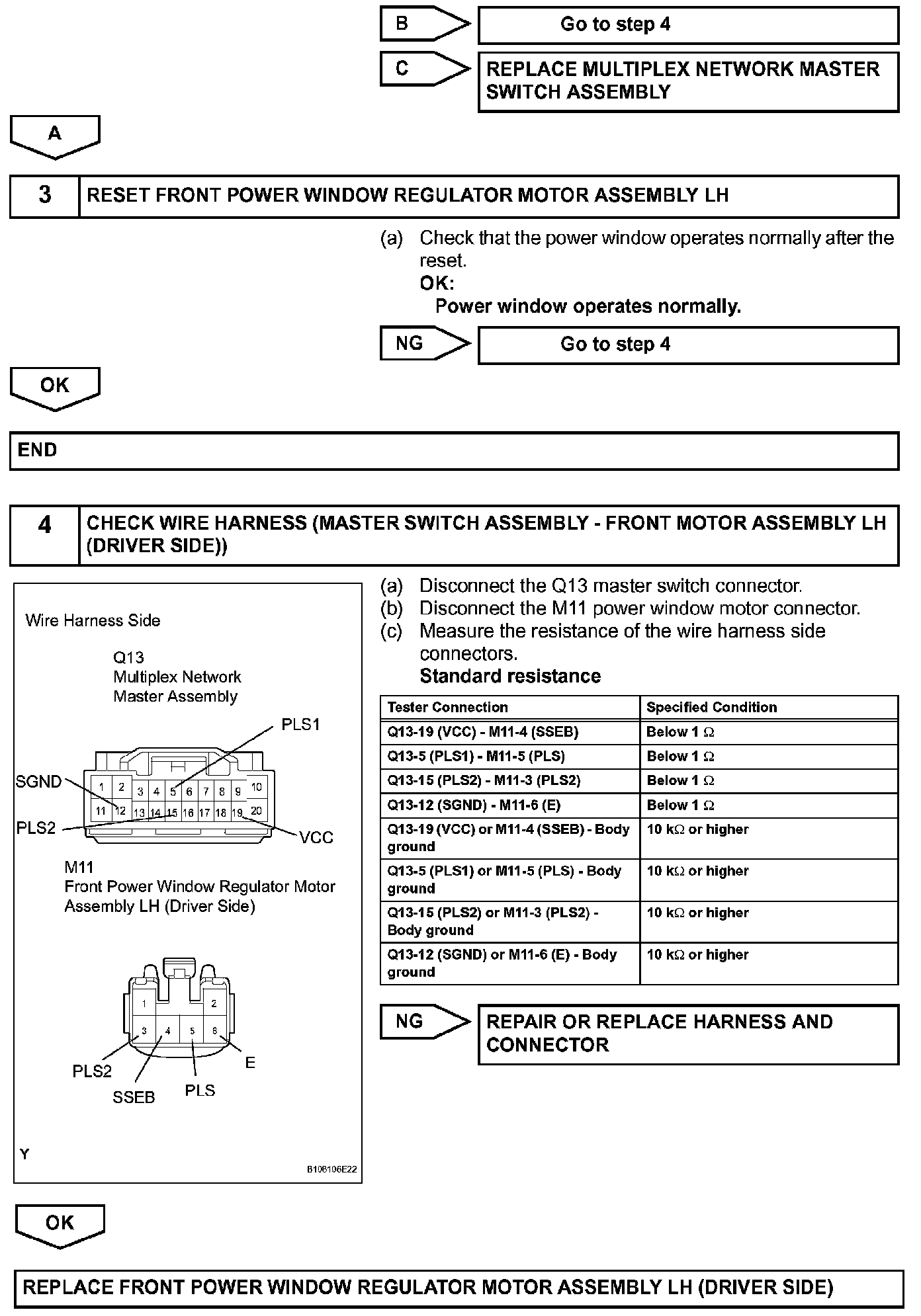 - The recorded power window fully closed position, which is stored in the multiplex network master switch, was erased as a result of: 1) a fuse or relay related to the driver side power window being replaced; or 2) the battery cable and the master switch's connector being disconnected.