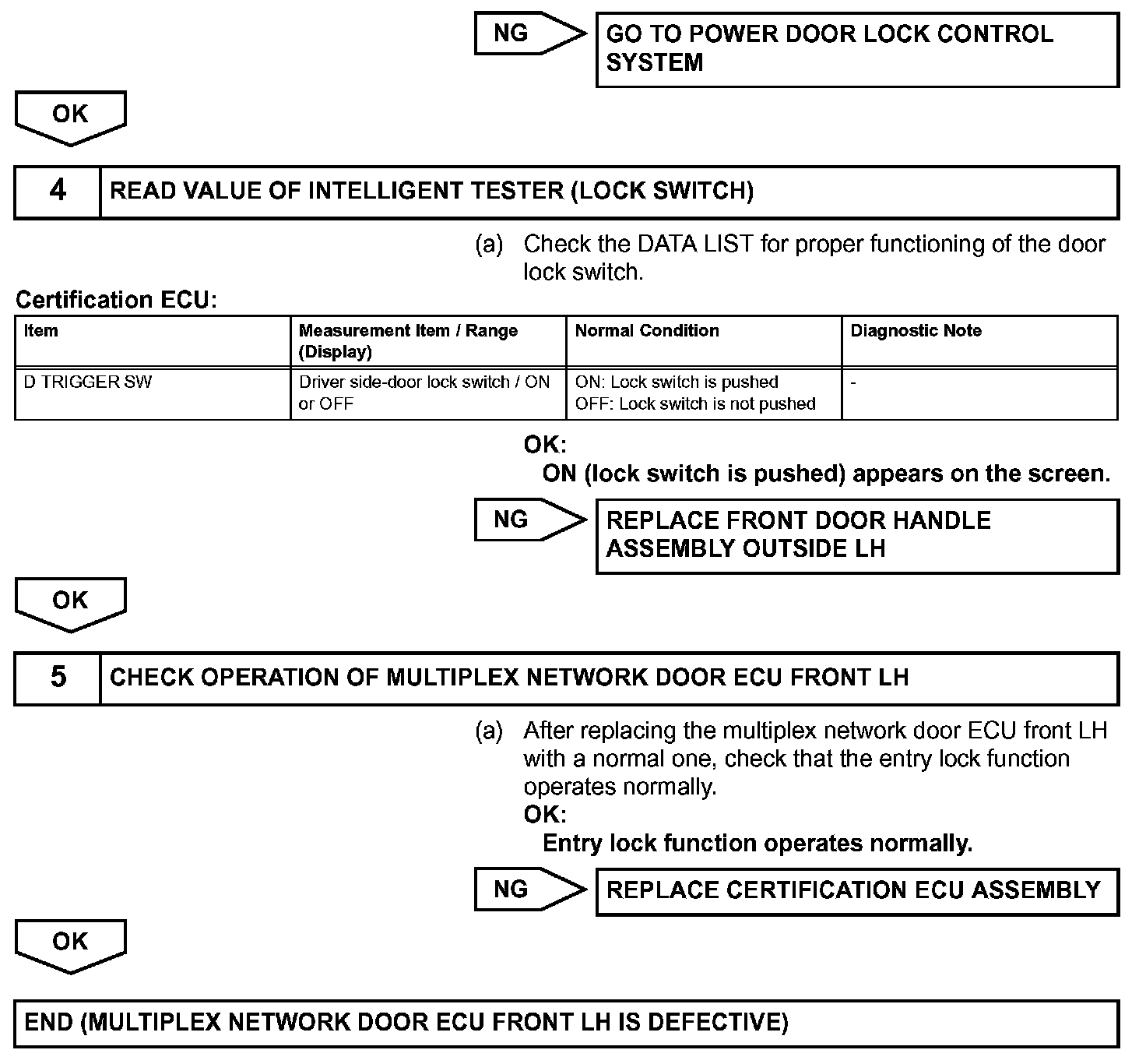 When the touch sensor inside the outside door handle front LH is touched, the multiplex network door ECU front LH (driver door ECU) sends a request signal to the door electrical key oscillator front LH. The key receives this request and transmits its ID code. Upon receiving the ID code, the certification ECU determines that the key is outside the vehicle and sends a lock signal to the driver side door lock through the cowl side junction block RH (multiplex network body ECU).