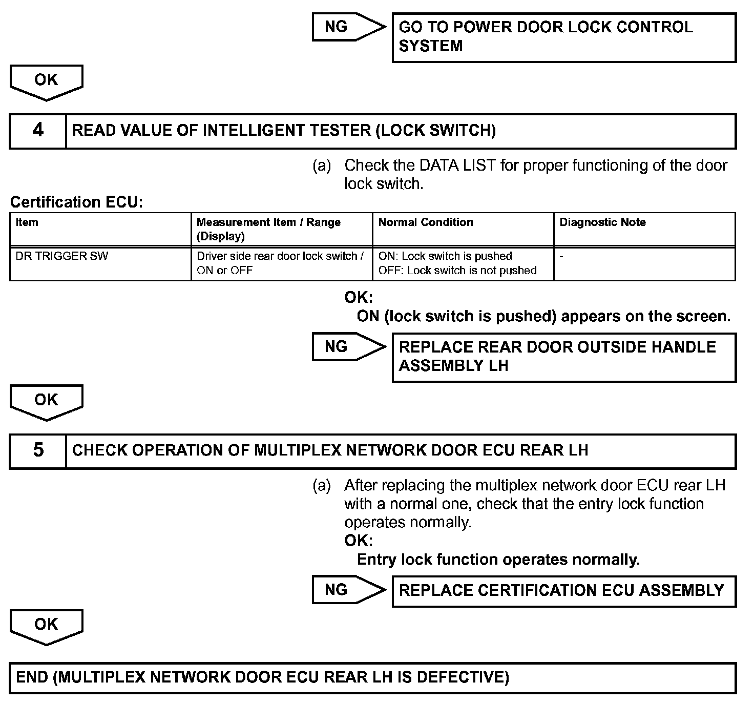 When the touch sensor inside the outside door handle rear LH is touched, the multiplex network door ECU rear LH (rear door LH ECU) sends a request signal to the door electrical key oscillator rear LH. The key receives this request and transmits its ID code. Upon receiving the ID code, the certification ECU determines that the key is outside the vehicle and sends a lock signal to the rear door LH lock through the cowl side junction block RH (multiplex network body ECU).