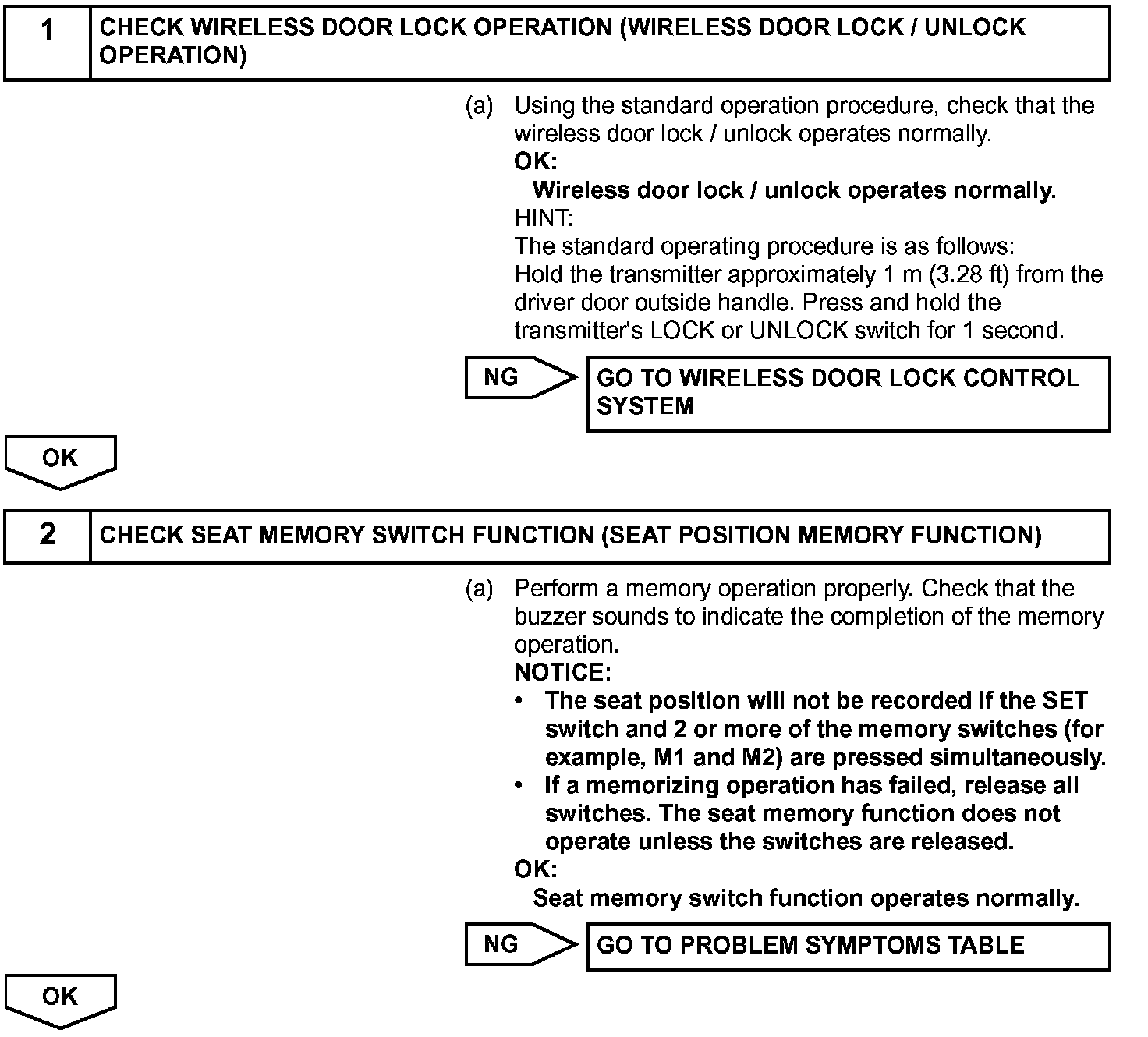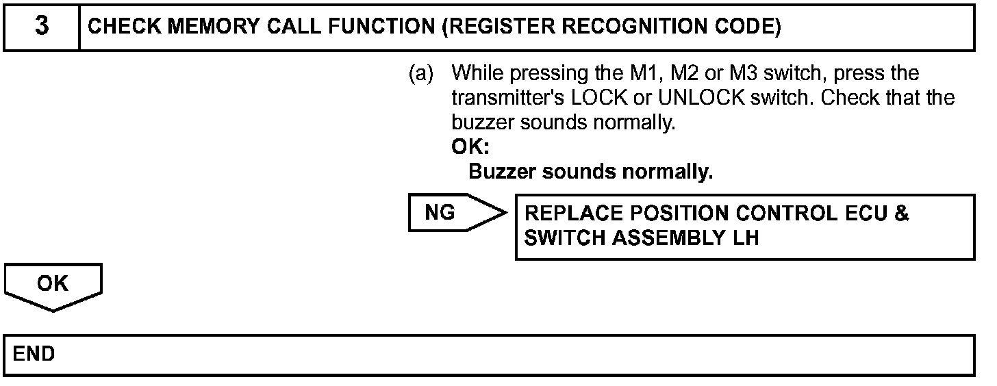 With the engine switch off and the driver side door closed, press the M1, M2 or M3 switch and the transmitter's LOCK or UNLOCK switch. The multiplex network body ECU will receive a key recognition code signal through wireless radio waves, and send the key recognition code signal to the position control ECU & switch assembly via the BEAN line. The position control ECU & switch assembly then organizes the key recognition code received from the memory switch and sounds the buzzer (answer back) when the code is registered.