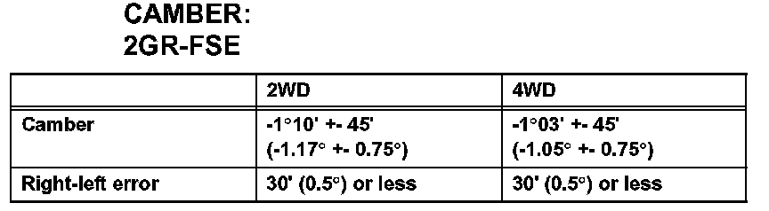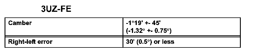If the measured value is not within the specified range, inspect the suspension parts for damage and wear. Replace parts as necessary because camber cannot be properly adjusted with any damaged or worn parts.