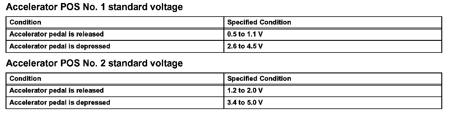 e. When depressing and releasing the accelerator pedal, check that the values of the accelerator POS No. 1 and POS No. 2 are within the specification.