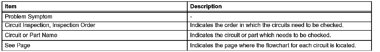 PROBLEM SYMPTOMS TABLEWhen a "Normal" code is output during a DTC check but the problem is still occurring, use the Problem Symptoms Table. The suspected areas (circuits or parts) for each problem symptom are in the table. The suspected areas are listed in order of probability. A description of each of the chart's columns.