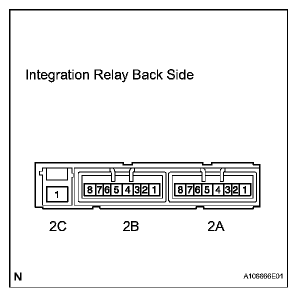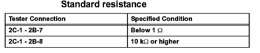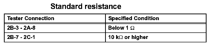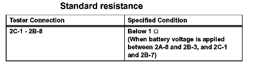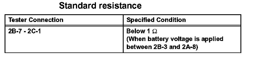 2. Connect the positive (+) battery lead to terminal 2A-8 and negative (-) lead to terminal 2B-3. Using an ohmmeter, measure the resistance between terminals 2B-7 and 2C-1 when battery voltage is applied between the terminals.