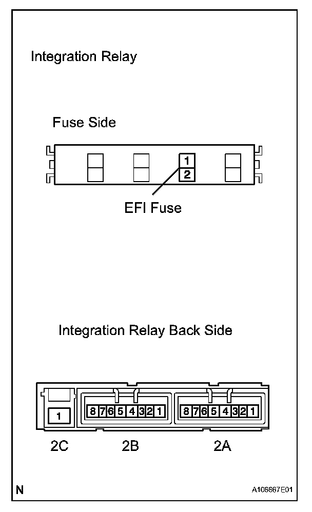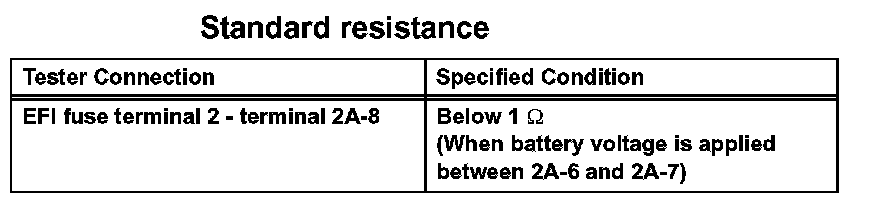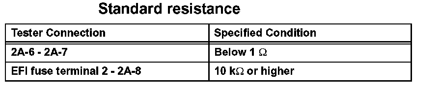 2. Connect the positive (+) battery lead to terminal 2A-6 and negative (-) lead to terminal 2A-7. Using an ohmmeter, measure the resistance between the EFI fuse terminal 2 and terminal 2A-8 when battery voltage is applied between the terminals.