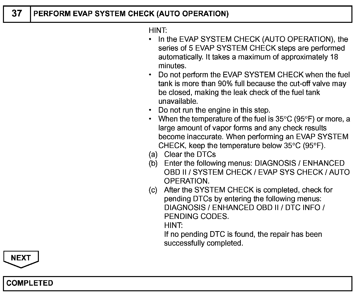 HINT: After a repair, check Monitor Status by performing the key-off monitor confirmation and purge flow monitor confirmation described.