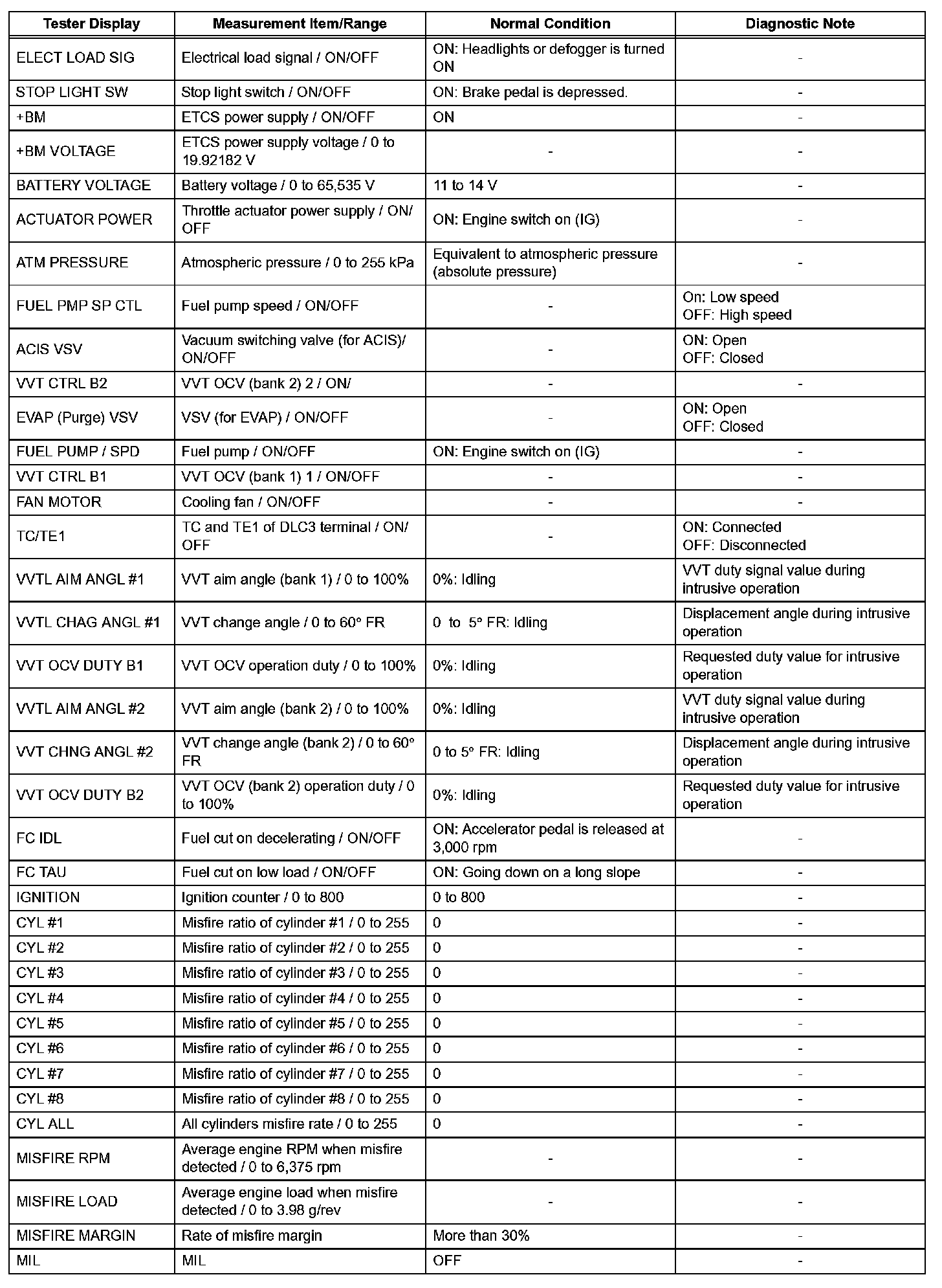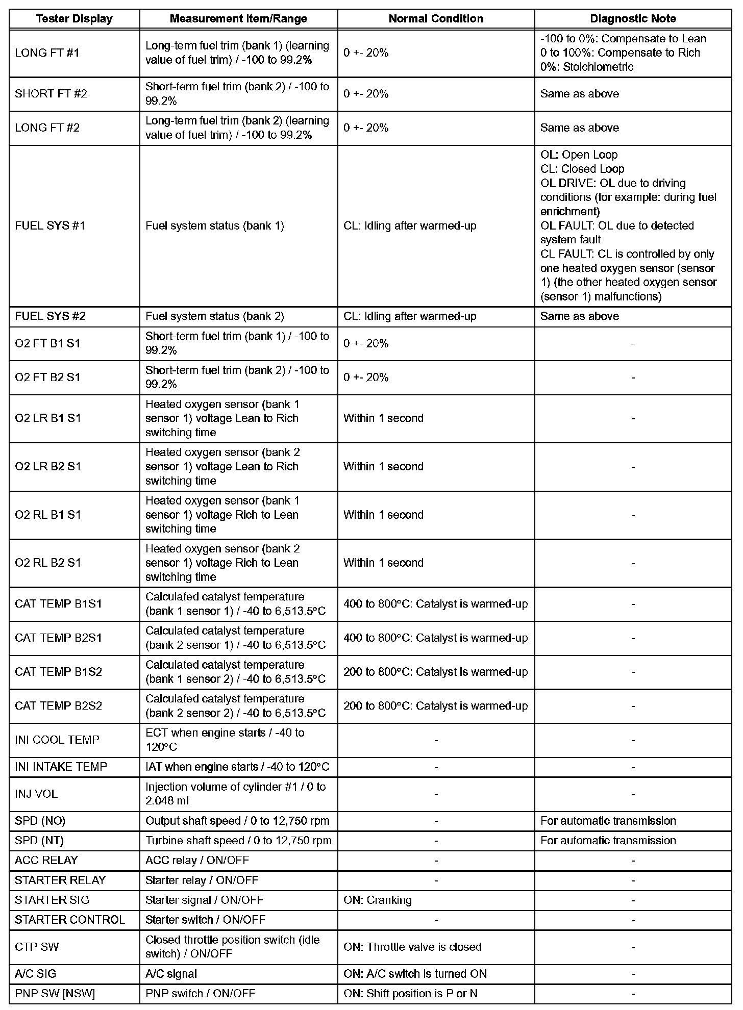 DATA LISTHINT: Using the intelligent tester's DATA LIST allows switch, sensor, actuator and other item values to be read without removing any parts. Reading the DATA LIST early in troubleshooting is one way to save time.