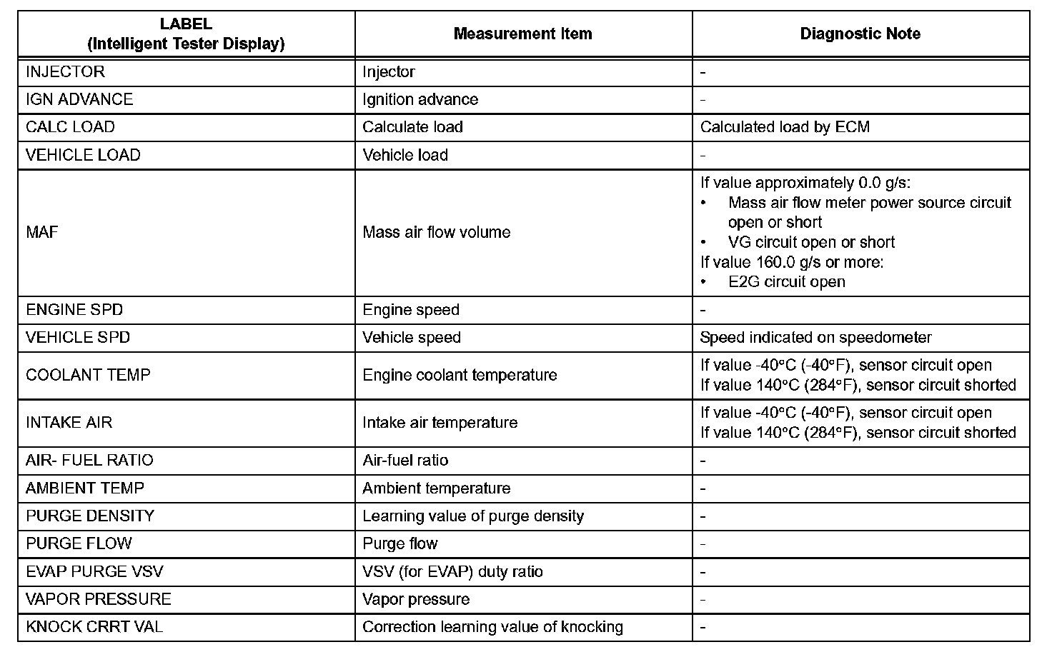 HINT: If it is impossible to replicate the problem even though a DTC is detected, confirm the freeze frame data. The ECM records engine conditions in the form of freeze frame data every 0.5 seconds. Using the intelligent tester, five separate sets of freeze frame data, including the data values at the time when the DTC was set, can be checked.