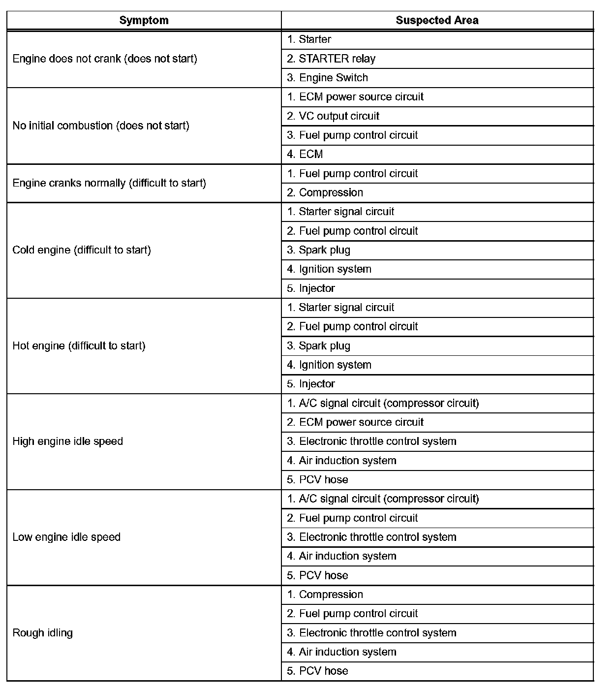 HINT: Use the table to help determine the cause of the problem symptom. The potential cases of the symptoms are listed in order of probability in the "Suspected Area" column of the table. Check each symptom by checking the suspected areas in the order they are listed. Replace parts as necessary.