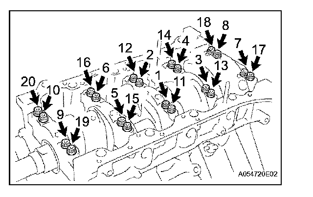 Install and uniformly tighten the 20 crankshaft bearing cap bolts in several passes in the sequence shown in the illustration.