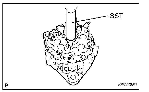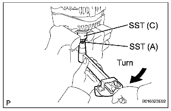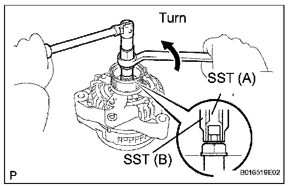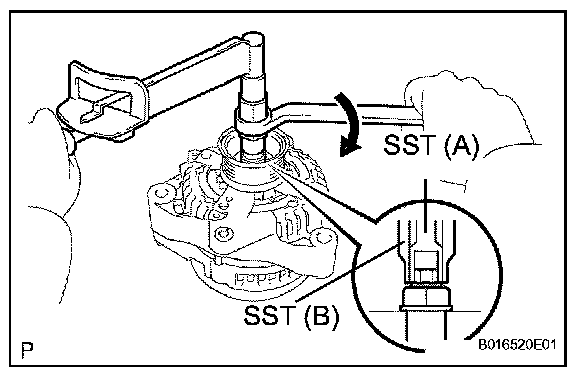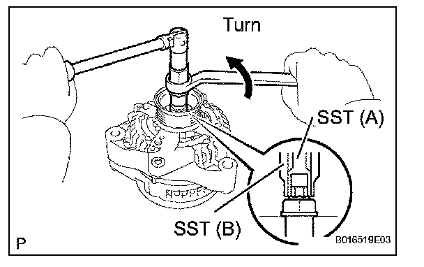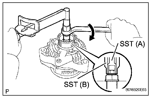 b. Hold SST (A) with a torque wrench, and tighten SST (B) clockwise to the specified torque.