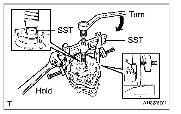 e. To loosen the pulley nut, turn SST (A) in the direction given in the illustration.