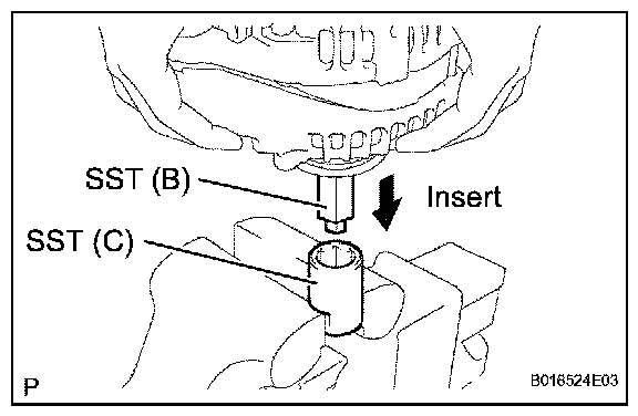 d. Insert SST (B) into SST (C), and attach the pulley nut to SST (C).