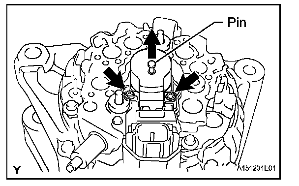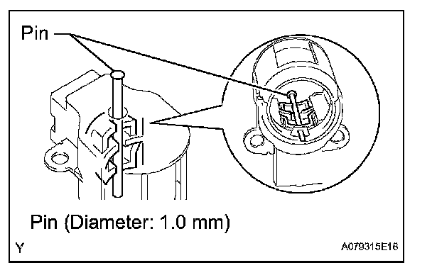 a. While pushing the 2 brushes toward the inside of the brush holder, insert a pin (Dia 1.0 mm (0.039 in.)) into the brush holder hole.