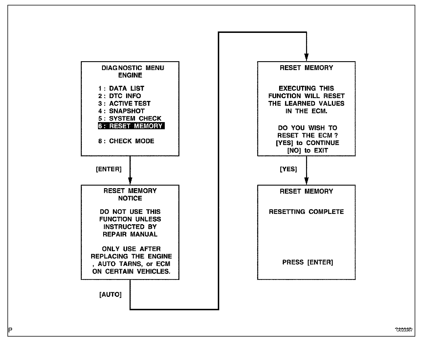 The ECM memorizes the condition that the ECT controls the automatic transmission assembly and engine assembly according to those characteristics. Therefore, when the automatic transmission assembly, engine assembly, or ECM has been replaced, it is necessary to reset the memory so that the ECM can memorize the new information.