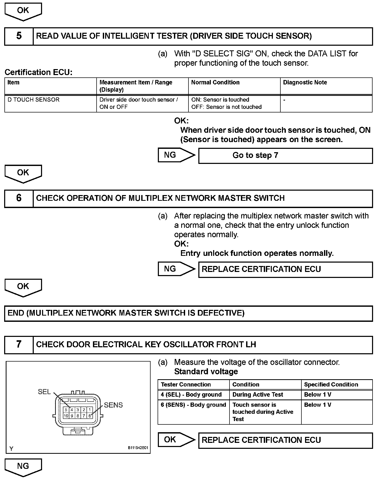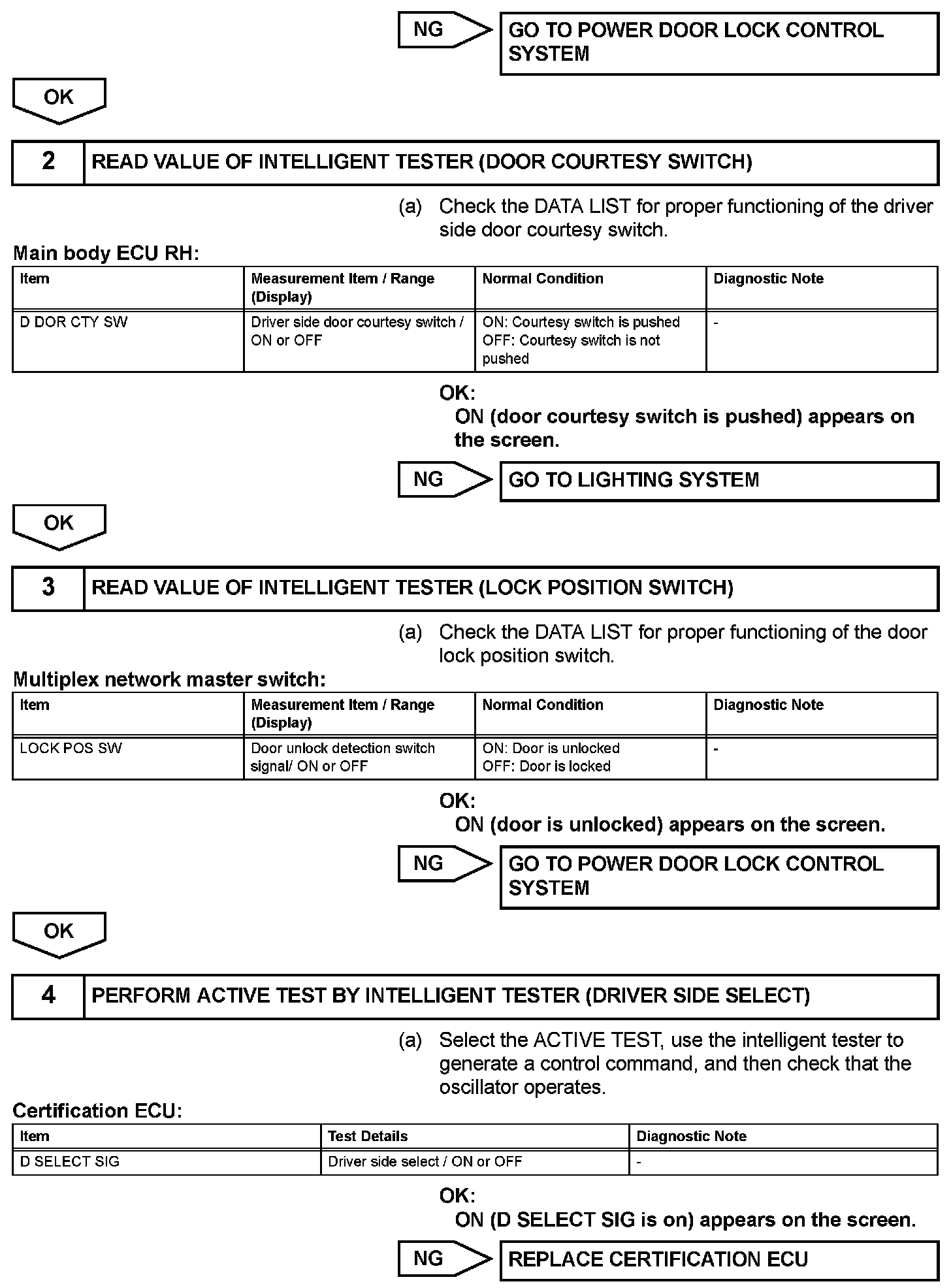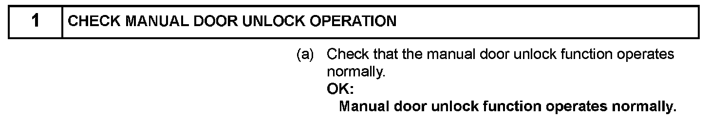 When an ID code from the door electrical key oscillator front LH matches an ID code from the key, the certification ECU outputs a SEL signal (Lo when output) to the door electrical key oscillator front LH, activates the touch sensor inside the outside door handle, and enters unlock standby mode. When the touch sensor is touched, the door electrical key oscillator front LH sends a SENS signal (Lo when output) to the certification ECU and the certification ECU sends an unlock signal to the driver side door lock.