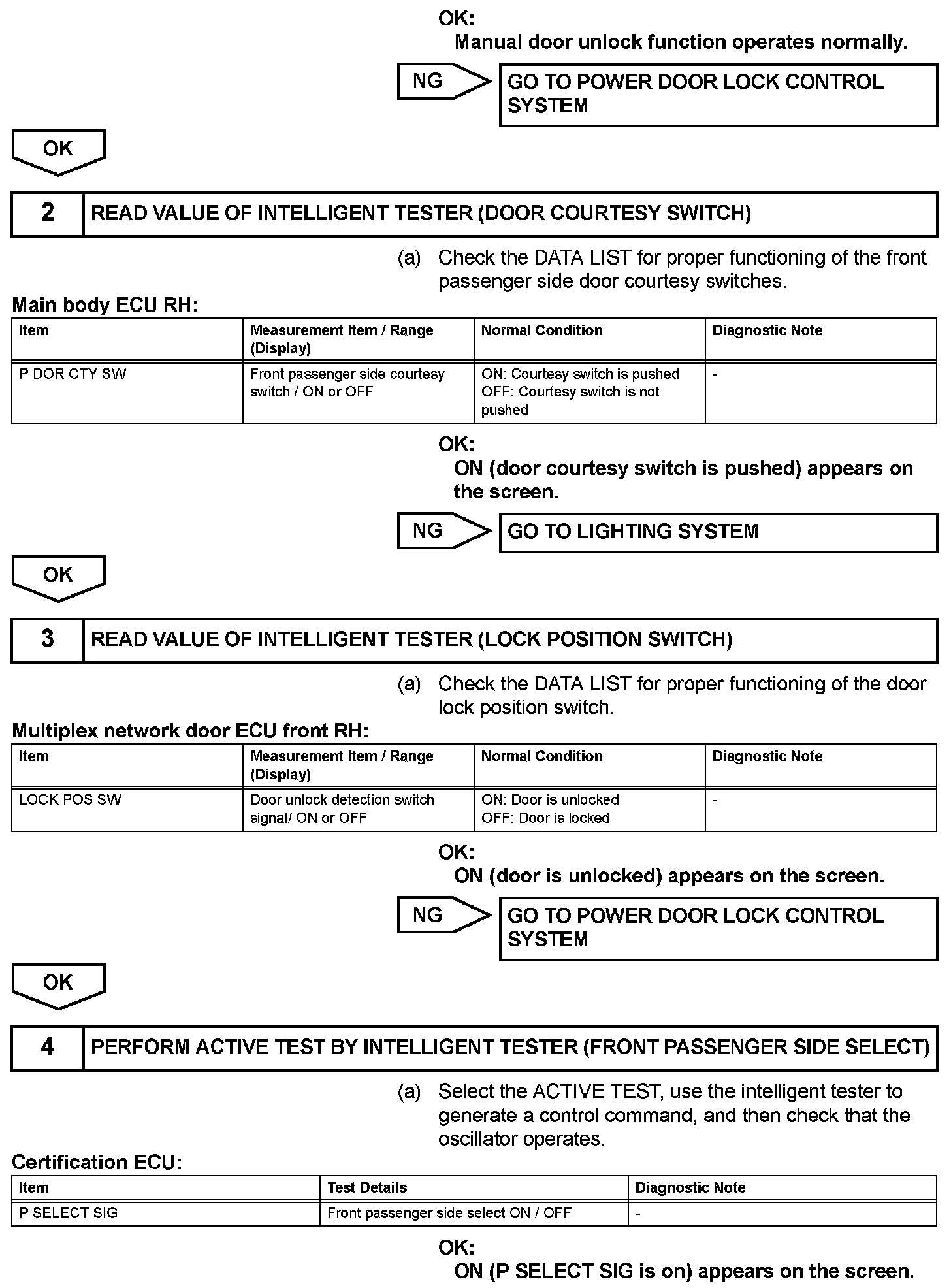When an ID code from the door electrical key oscillator front RH matches an ID code from the key, the certification ECU outputs a SEL signal (Lo when output) to the door electrical key oscillator front RH, activates the touch sensor inside the outside door handle, and enters unlock standby mode. When the touch sensor is touched, the door electrical key oscillator front RH sends a SENS signal (Lo when output) to the certification ECU and the certification ECU sends an unlock signal to the front passenger side door lock.