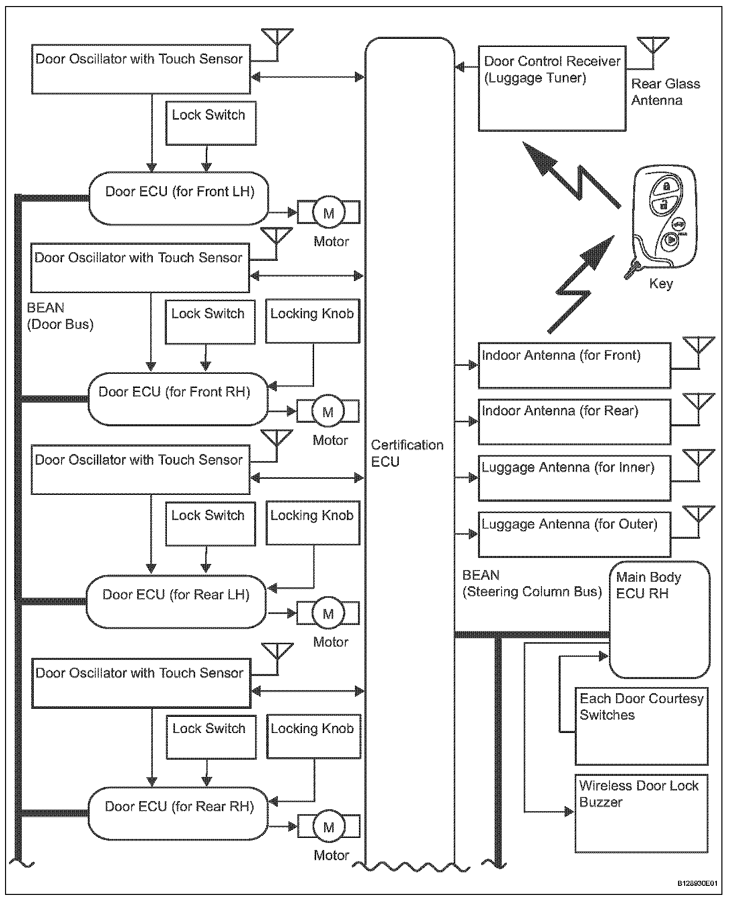 - This system is controlled by the certification ECU. When the certification ECU detects the presence of the key in one of the detection areas, it identifies and checks the ID code, and outputs operation signals to the related ECU in accordance with their functions.