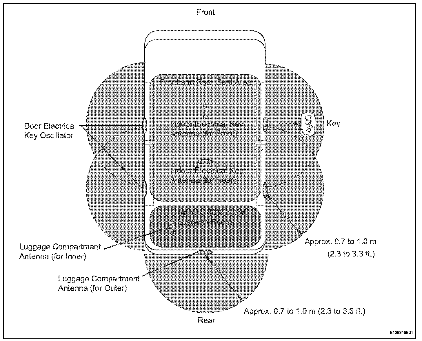 - The detection areas are formed by 4 oscillators and 4 antennas (4 door oscillators, 2 luggage compartment antennas, and 2 indoor antennas).