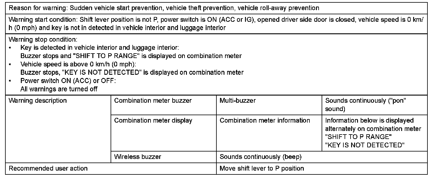 1. Pattern 1: With shift lever on P, driver door is opened, key is brought out of vehicle, driver door is closed, and move away from vehicle is attempted