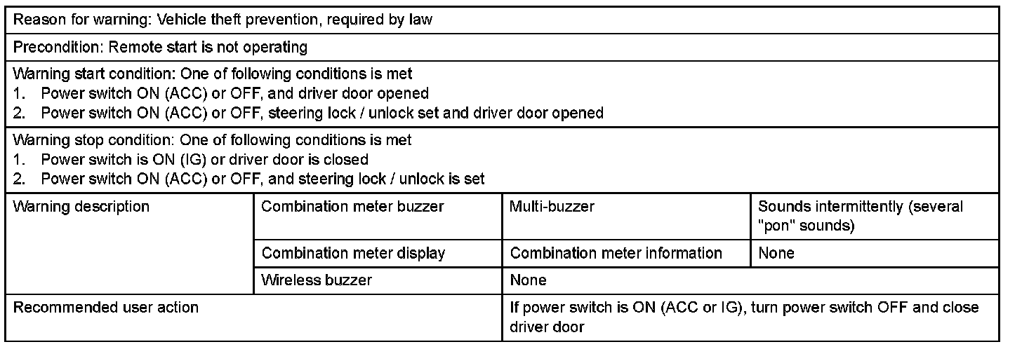 d. If the key is located inside of the cabin, the door lock function will not operate and the alarm buzzer (beep sound) will sound for 2 seconds.