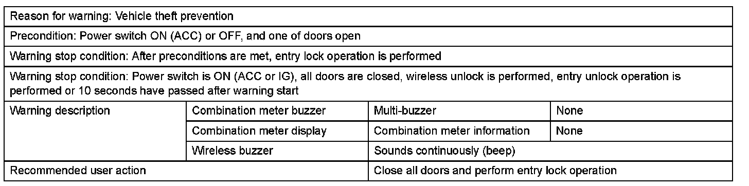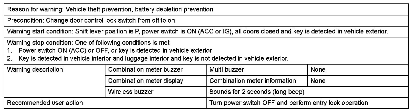 2. With shift lever on P and either power switch ON (ACC) or steering lock / unlock set, driver door is opened, move away from vehicle is performed, and door handle lock switch is pressed in an attempt to perform entry lock operation