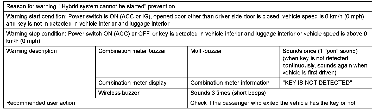 1. With key not in vehicle cabin or key battery depleted, hybrid system start is attempted or power switch ON (ACC or IG) operation is attempted