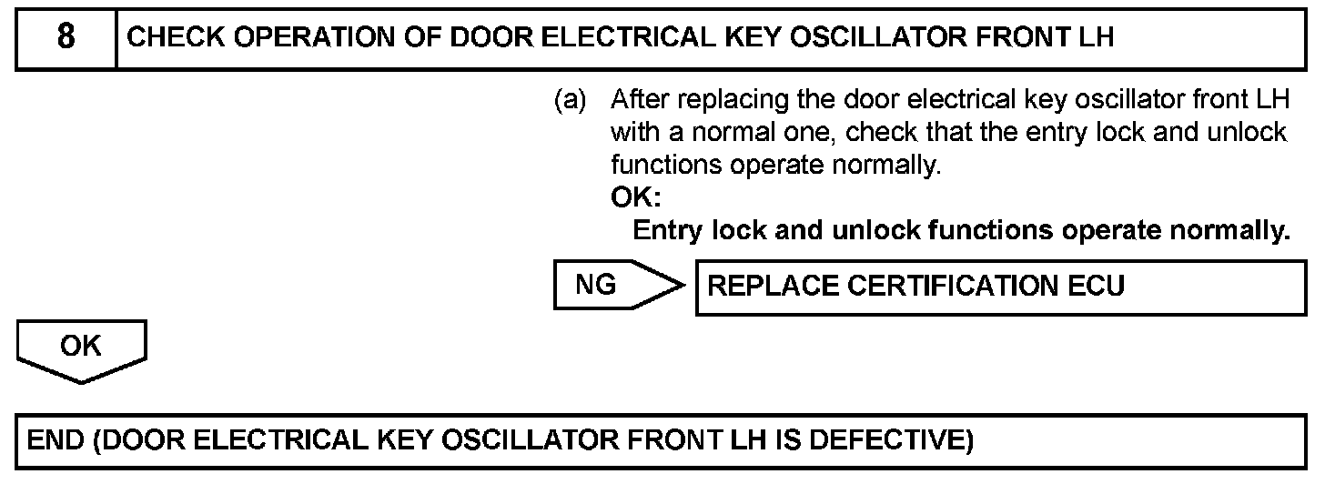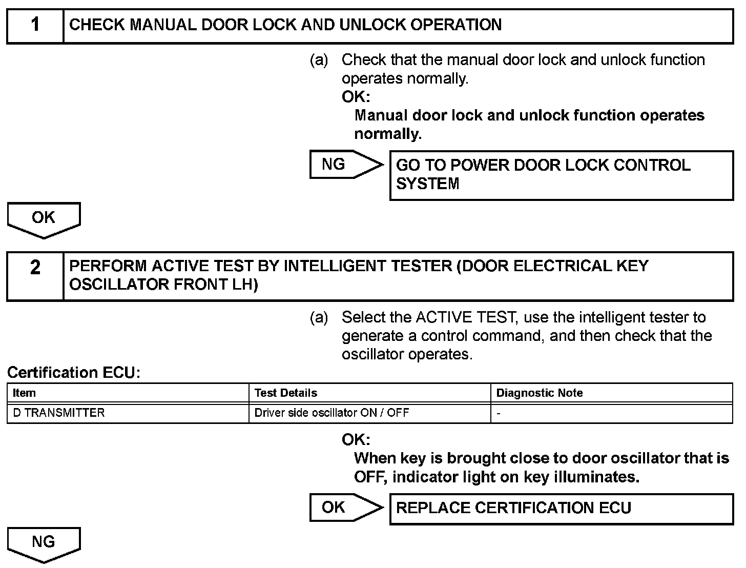 Both the entry lock and unlock functions do not operate when: 1) nothing is output from the door electrical key oscillator front LH, 2) the smart access system with push-button start is disabled through customization, or 3) the entire power door lock control system is malfunctioning.