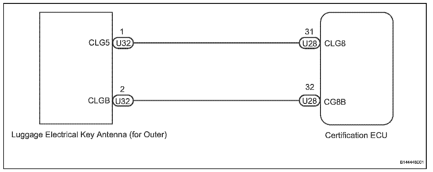 When the power luggage door open switch is turned ON, the certification ECU uses the luggage electrical key antenna (for outer) and antenna to output a request signal to the outside of the vehicle for a distance of approximately 1.0 m (3.3 ft.) from the luggage compartment door. A key near the luggage compartment door detects this request and transmits its ID code. The entry door control receiver receives the ID code and sends this ID code to the certification ECU. The certification ECU checks if the ID code is valid. When the ID code is valid, the certification ECU sends a luggage compartment door open signal to the main body ECU LH using the multiplex communication line and stops outputting request signals. The luggage room junction block then unlocks the luggage compartment door.