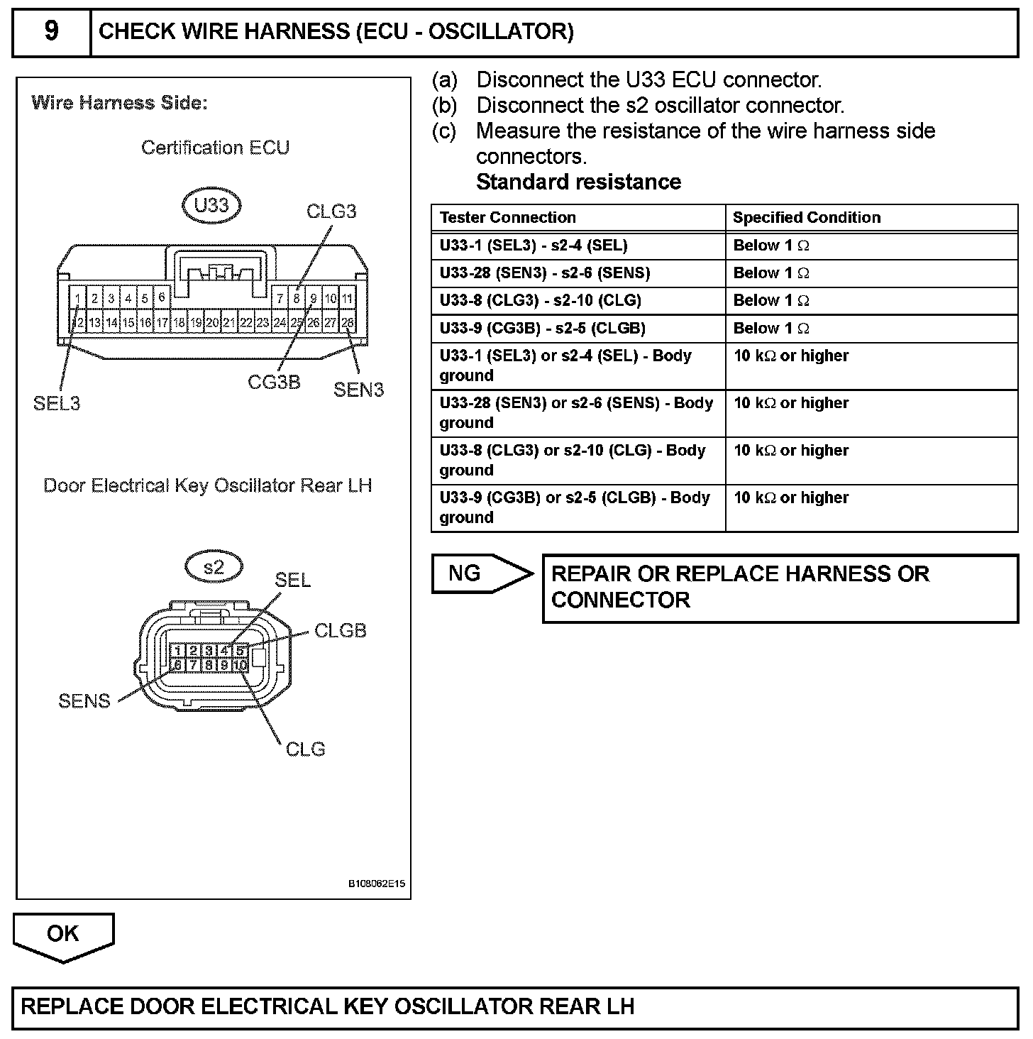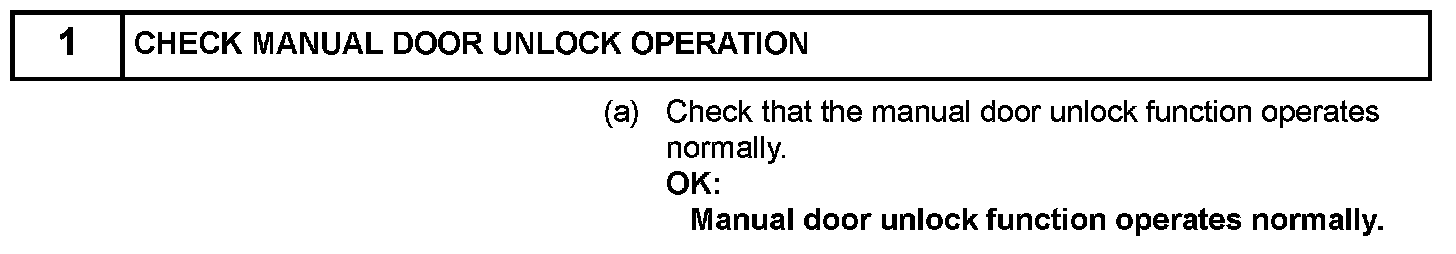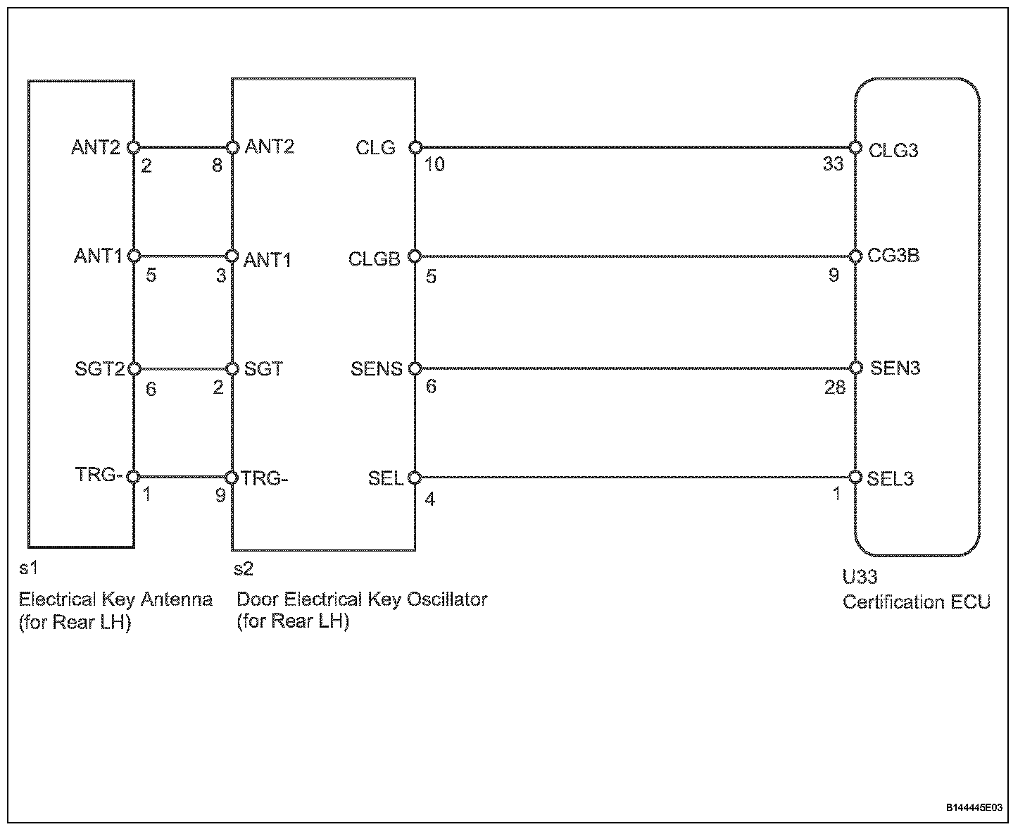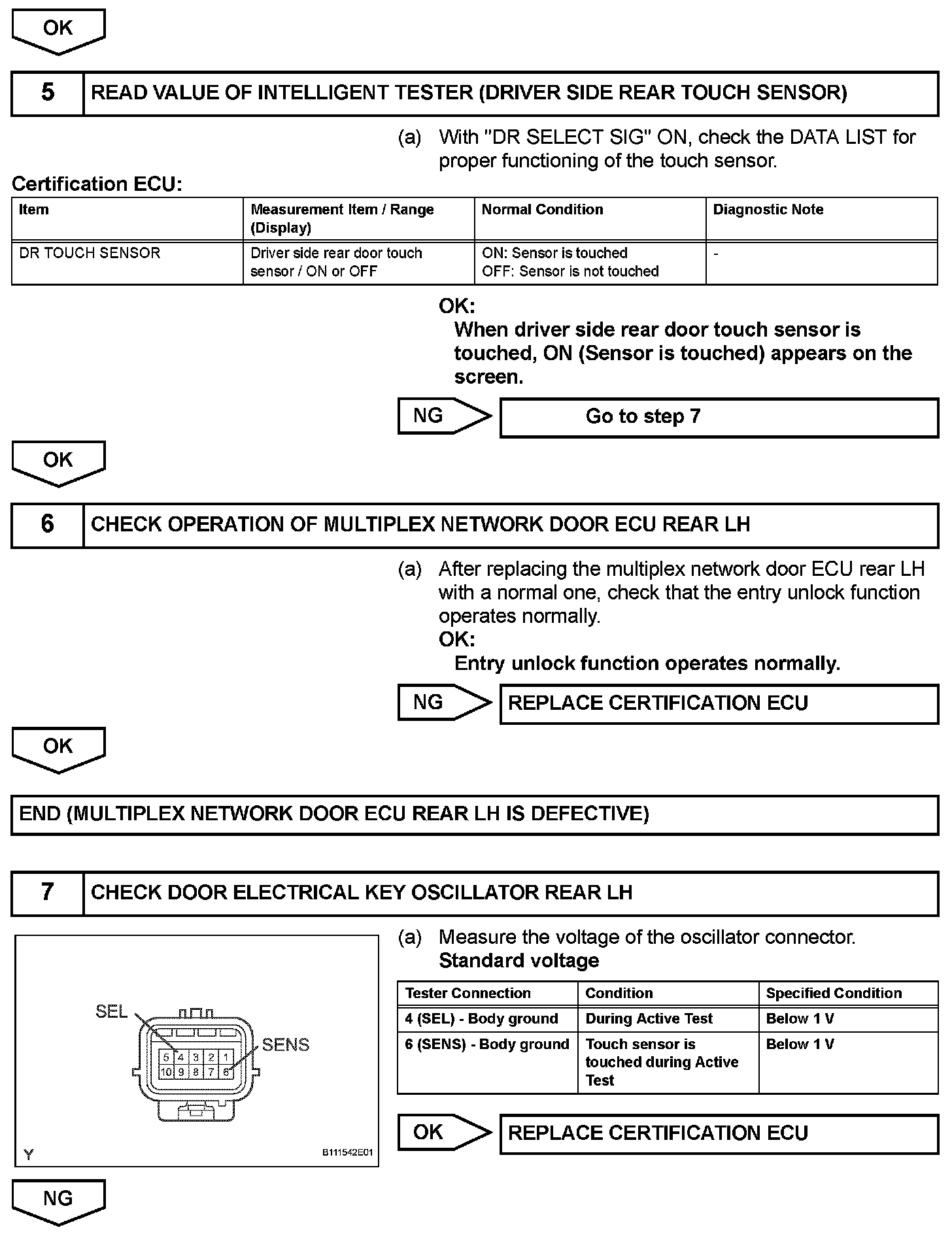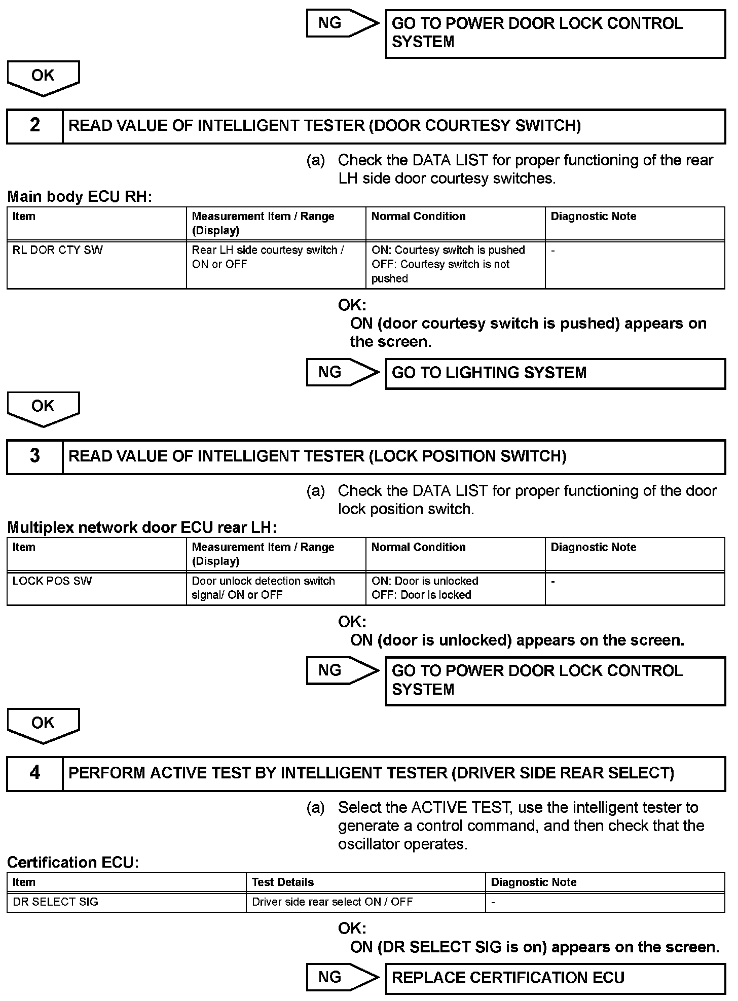When an ID code from the door electrical key oscillator rear LH matches an ID code from the key, the certification ECU outputs a SEL signal (Lo when output) to the door electrical key oscillator rear LH, activates the touch sensor inside the outside door handle, and enters unlock standby mode. When the touch sensor is touched, the door electrical key oscillator rear LH sends a SENS signal (Lo when output) to the certification ECU and the certification ECU sends an unlock signal to the rear door LH lock.