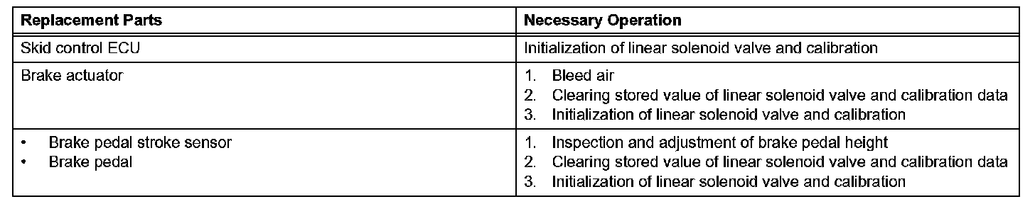 a. Perform initialization of linear solenoid valve and calibration when the skid control ECU, brake actuator or brake pedal stroke sensor is replaced. Follow the procedure to perform initialization.