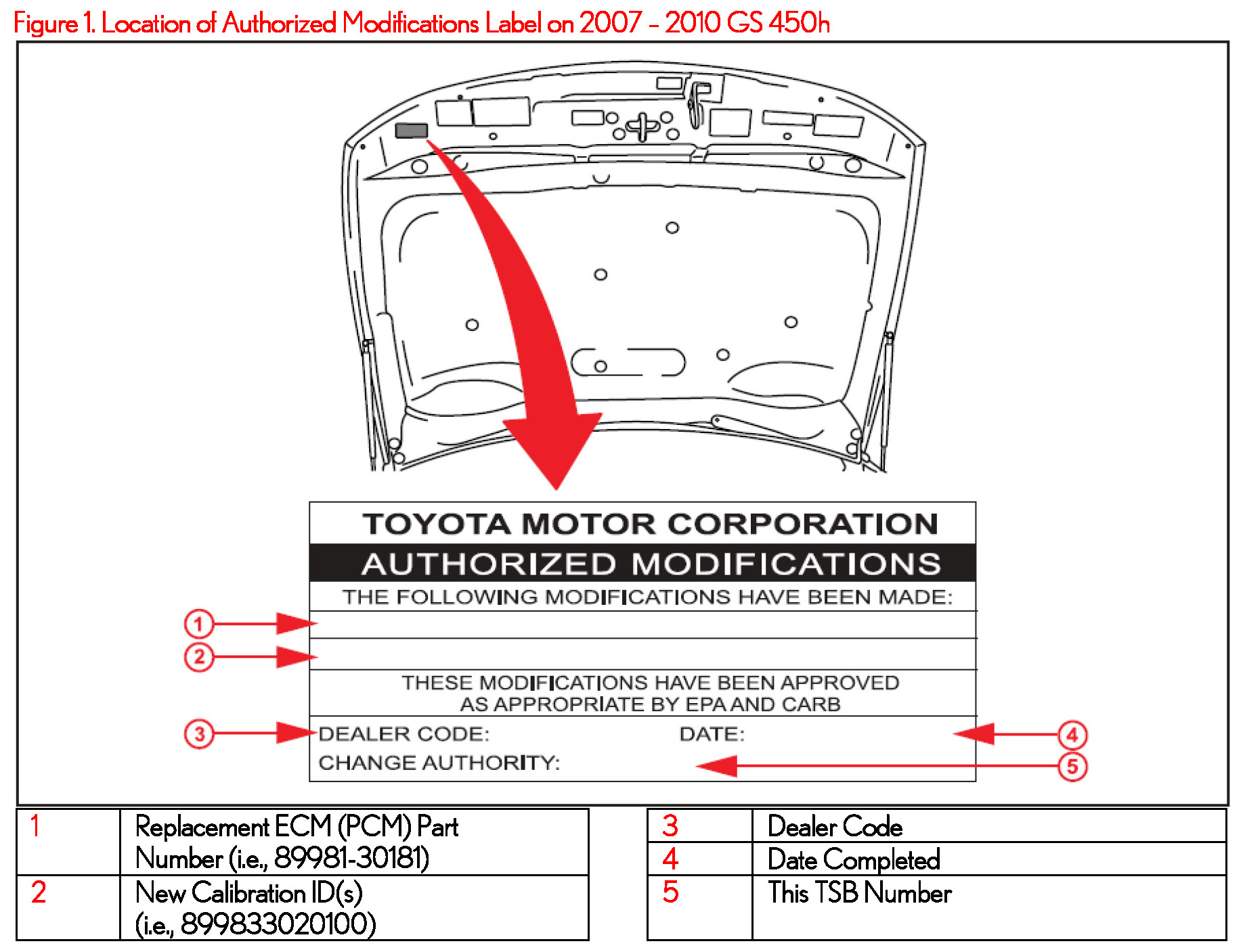 2. Check for the Authorized Modifications Label affixed to the vehicle in the location shown in Figure 1. Confirm the HV ECU calibration has been updated. If the calibration ID listed is NOT the latest HV ECU calibration, go to step 3 and follow the repair procedure outlined in this TSB.