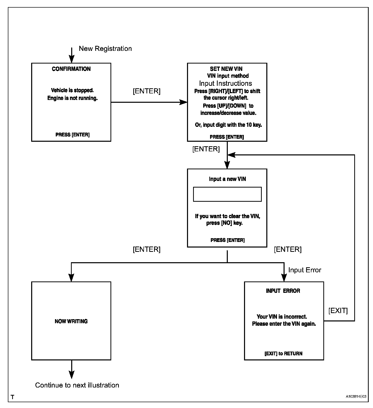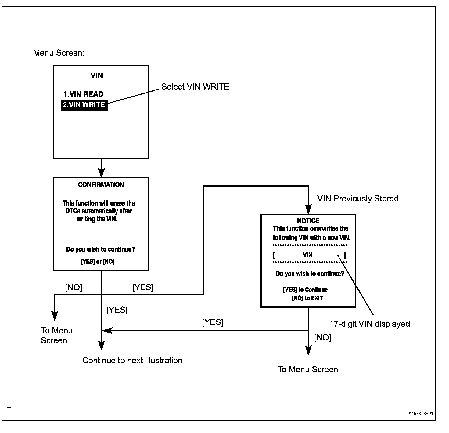 a. The VIN writing process is explained using a flowchart as shown. This process allows the VIN to be input into the HV control ECU. If the HV control ECU is changed, or the HV control ECU VIN and the vehicle's VIN do not match, the VIN can be registered, or overwritten in the HV control ECU by following this procedure.