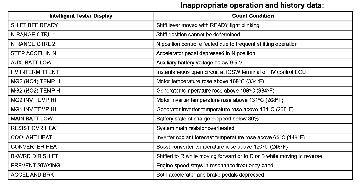 OPERATION HISTORY DATAHINT: The hybrid vehicle control ECU records inappropriate operations performed by the driver and the number of abnormal conditions that have been input to the ECU as operation history data.