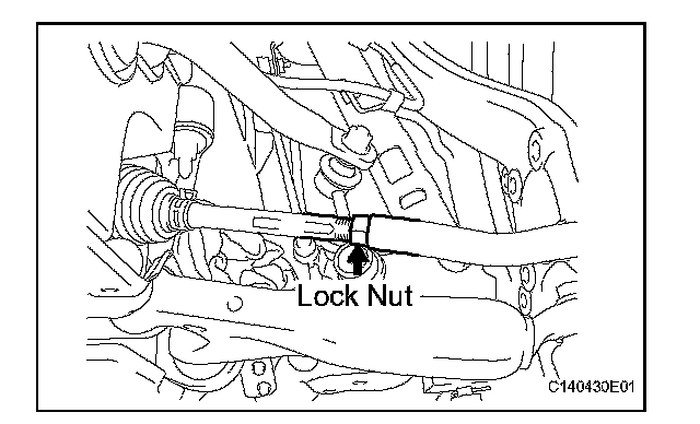 Temporarily tighten the lock nut while holding the hexagonal part of the steering rack end so that the lock nut and the steering rack end do not turn together. Hold the width across flat of the tie rod end and tighten the lock nut.