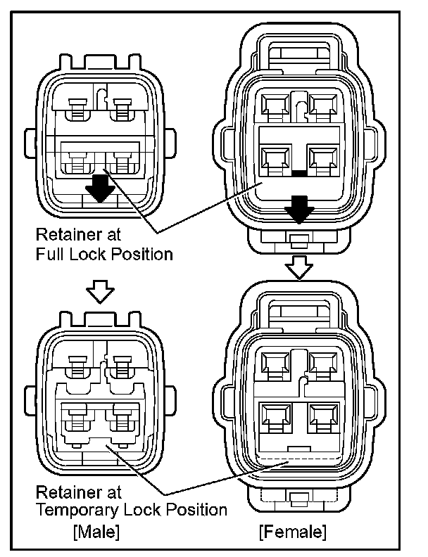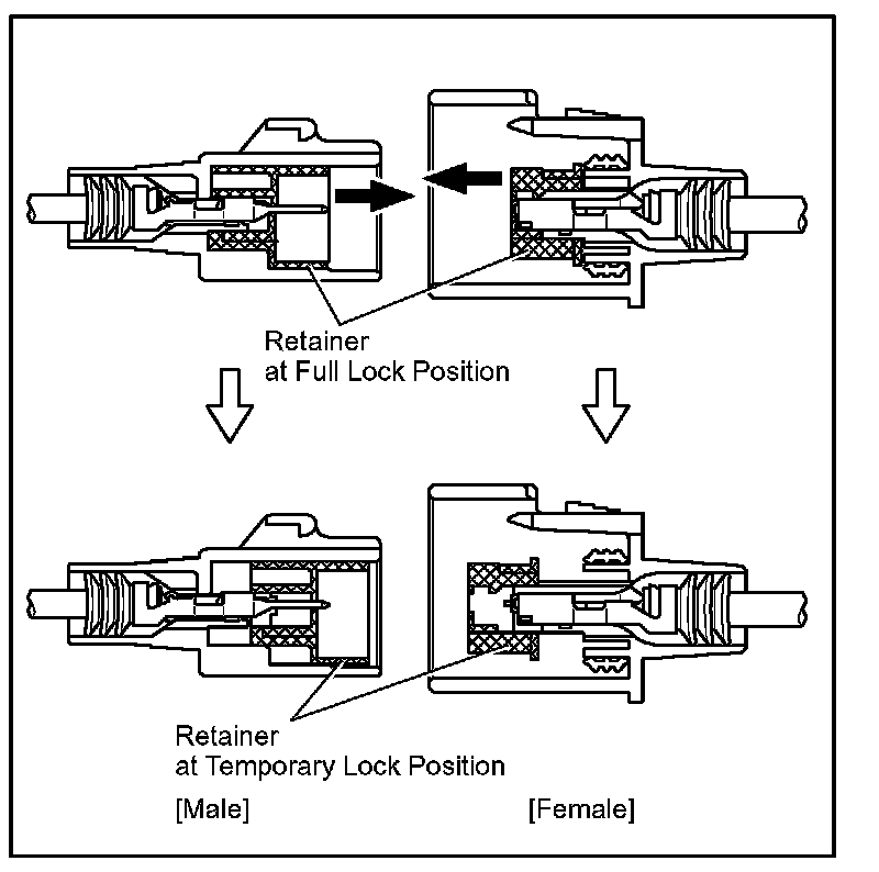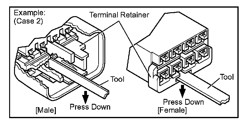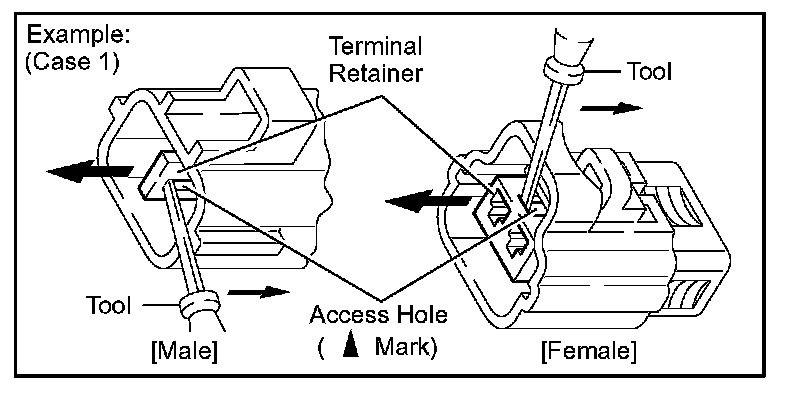 Insert the special tool into the terminal retainer access hole ( Mark) and pull the terminal retainer up to the temporary lock position.