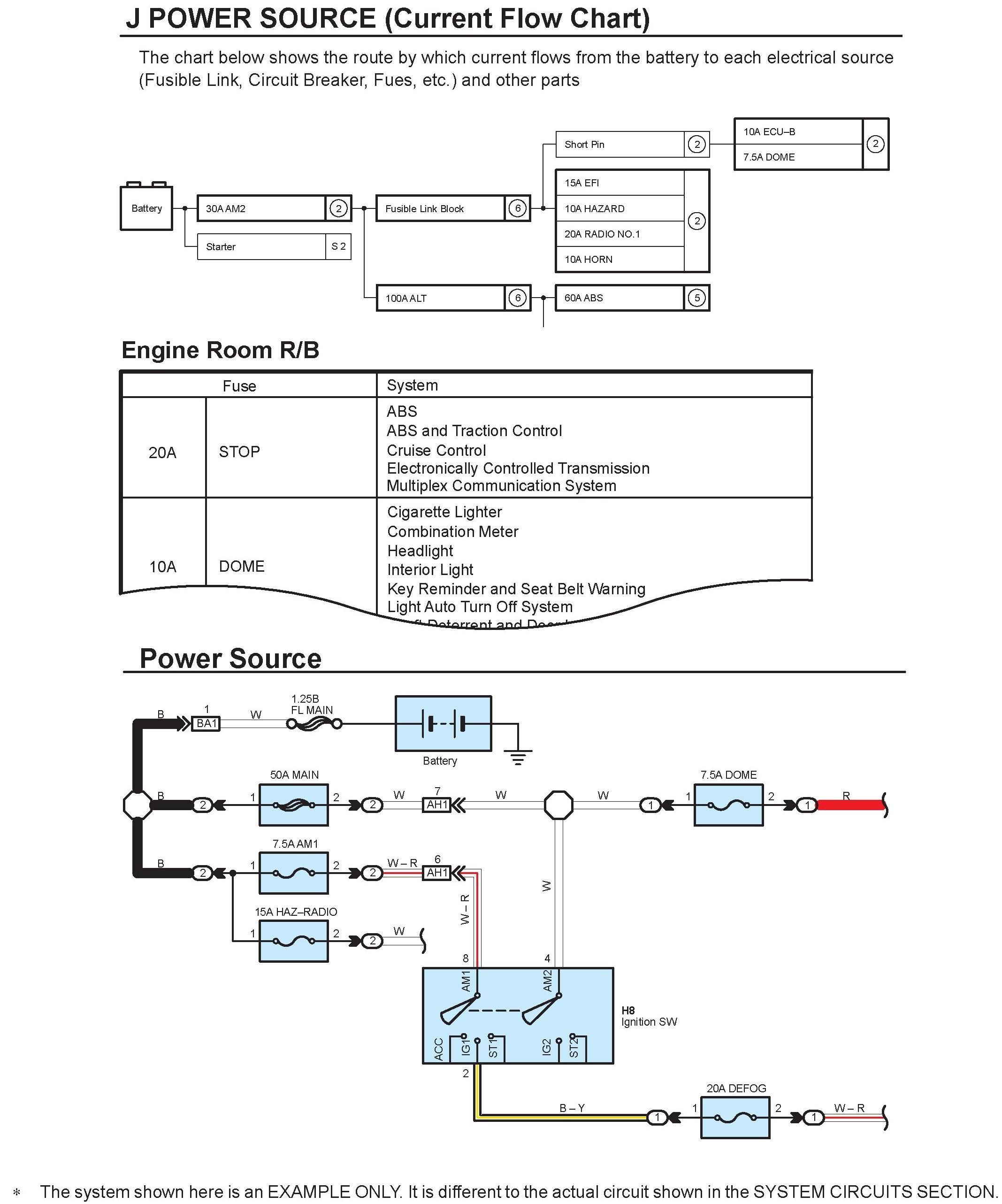 The "Current Flow Chart", describes which parts each power source (fuses, fusible links, and circuit breakers) transmits current to. In the Power Source circuit diagram, the conditions when battery power is supplied to each system are explained. Since all System Circuit diagrams start from the power source, the power source system must be fully understood.