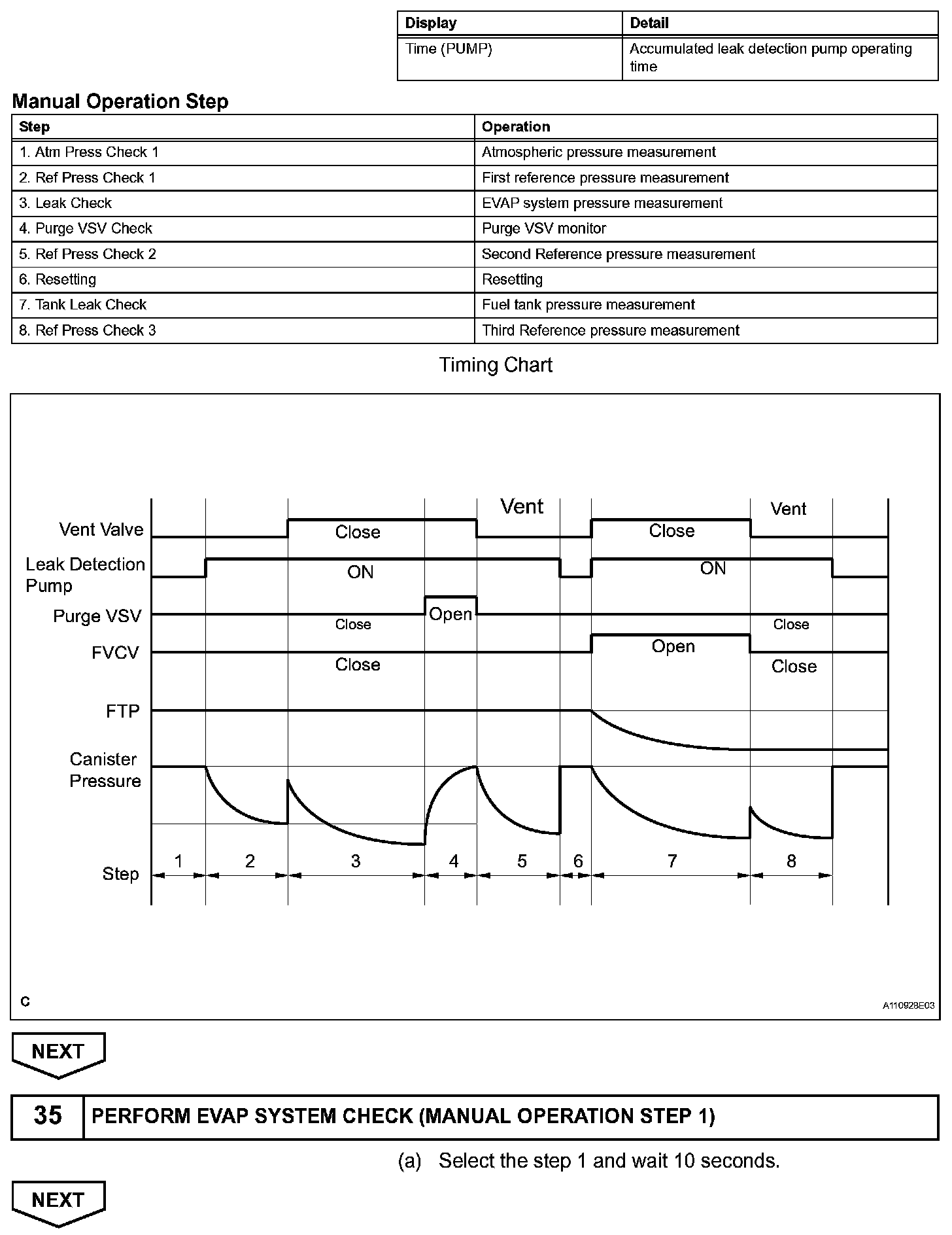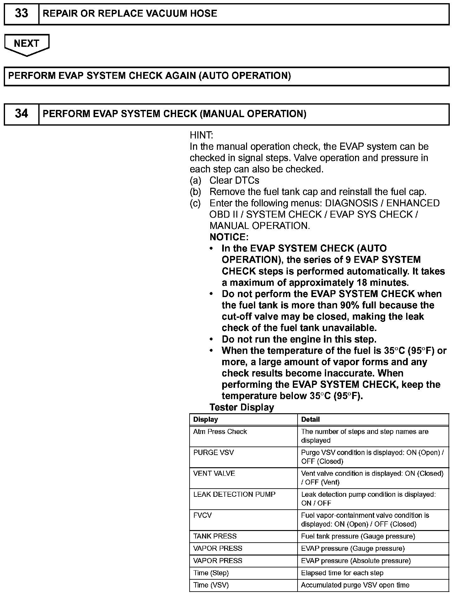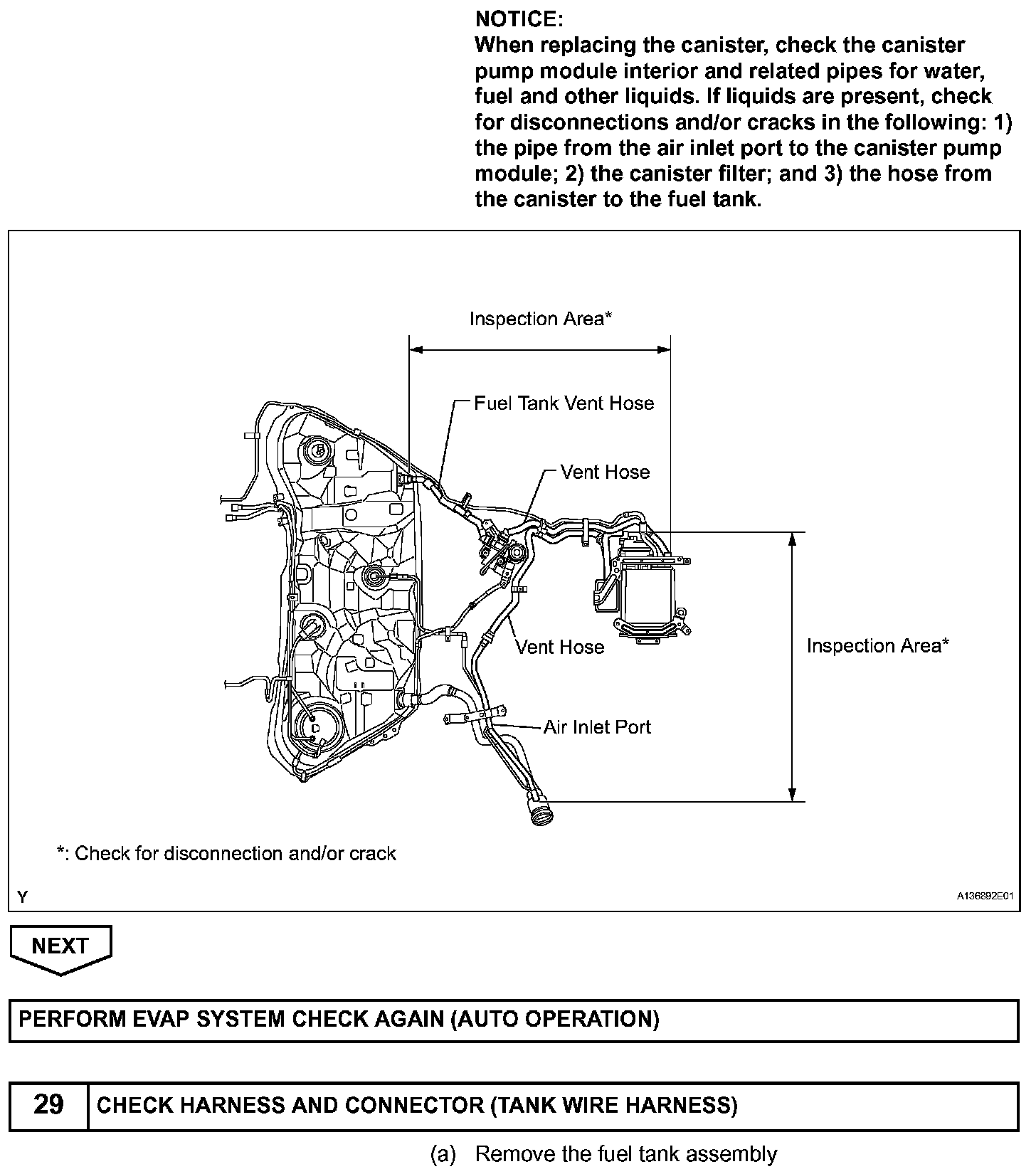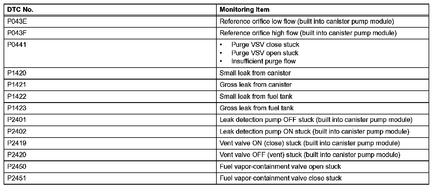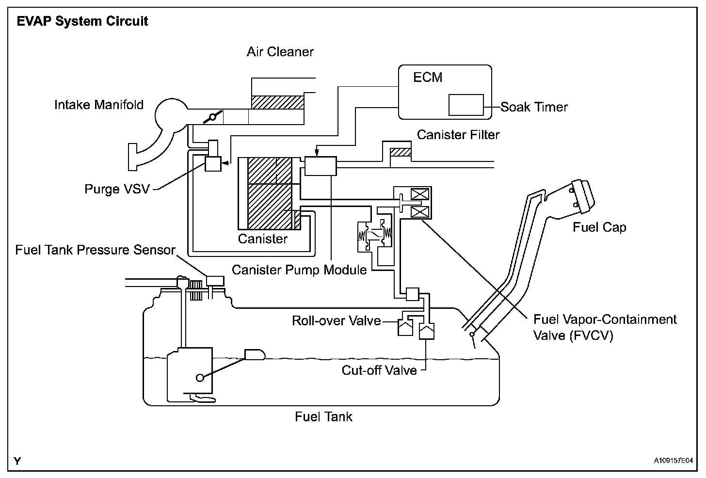 This monitoring system checks for canister pump module malfunctions and leaks from the EVAP and closed tank systems. Be sure to leave the vehicle for at least 5 hours to sufficiently cool the fuel and stabilize fuel tank pressure. This makes EVAP system monitoring more accurate.