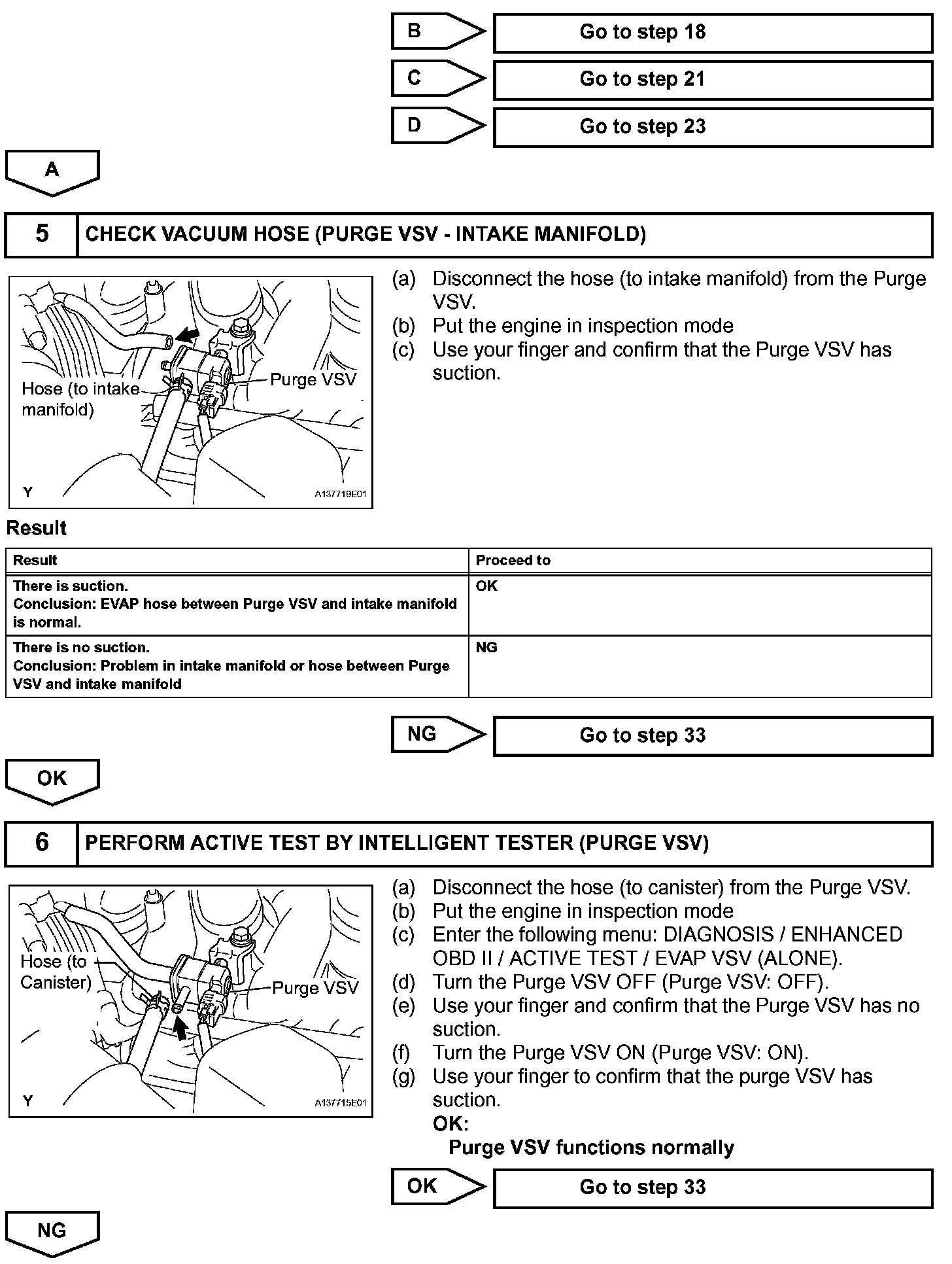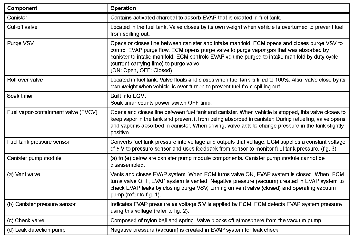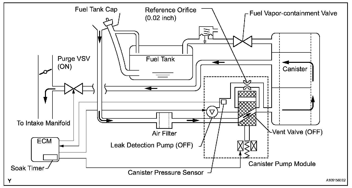 While the engine is running, if a predetermined condition (closed loop, etc.) is met, the purge VSV is opened by the ECM and stored fuel vapors in the canister are purged to the intake manifold. The ECM will change the duty cycle ratio of the purge VSV to control purge flow volume.