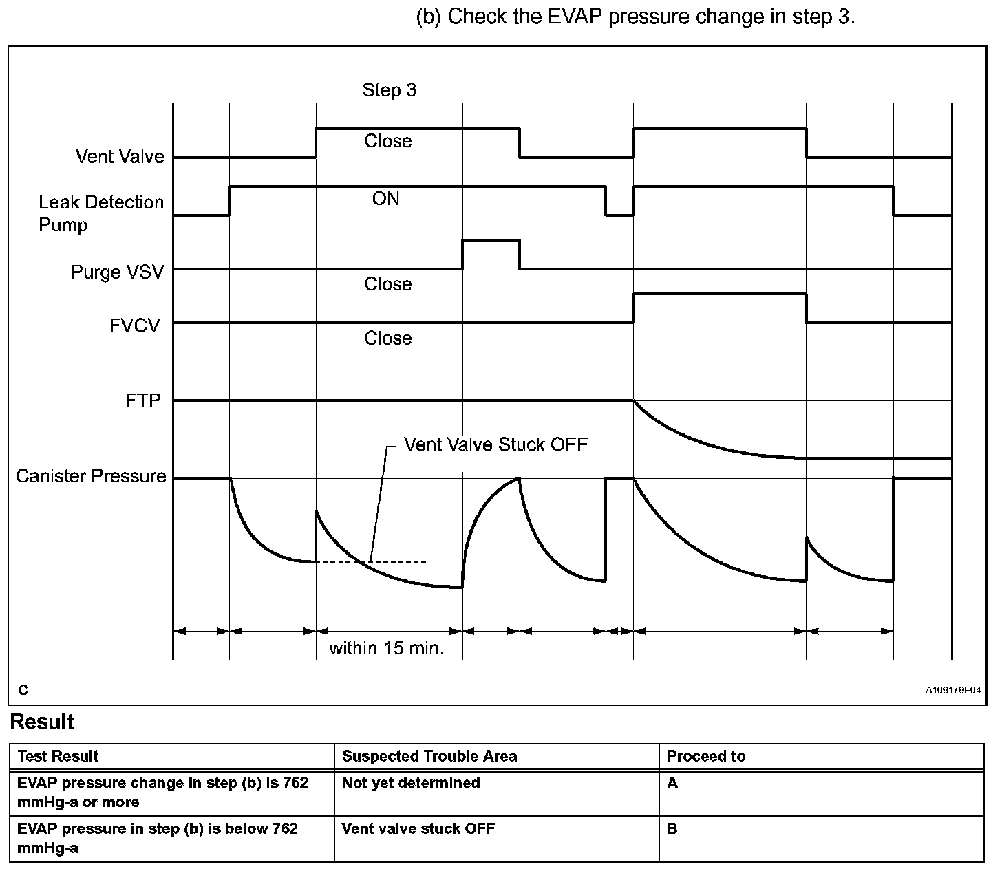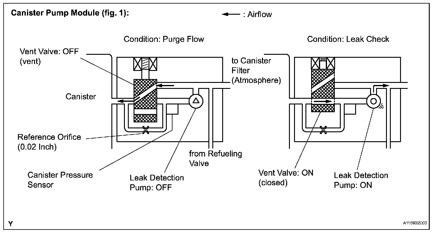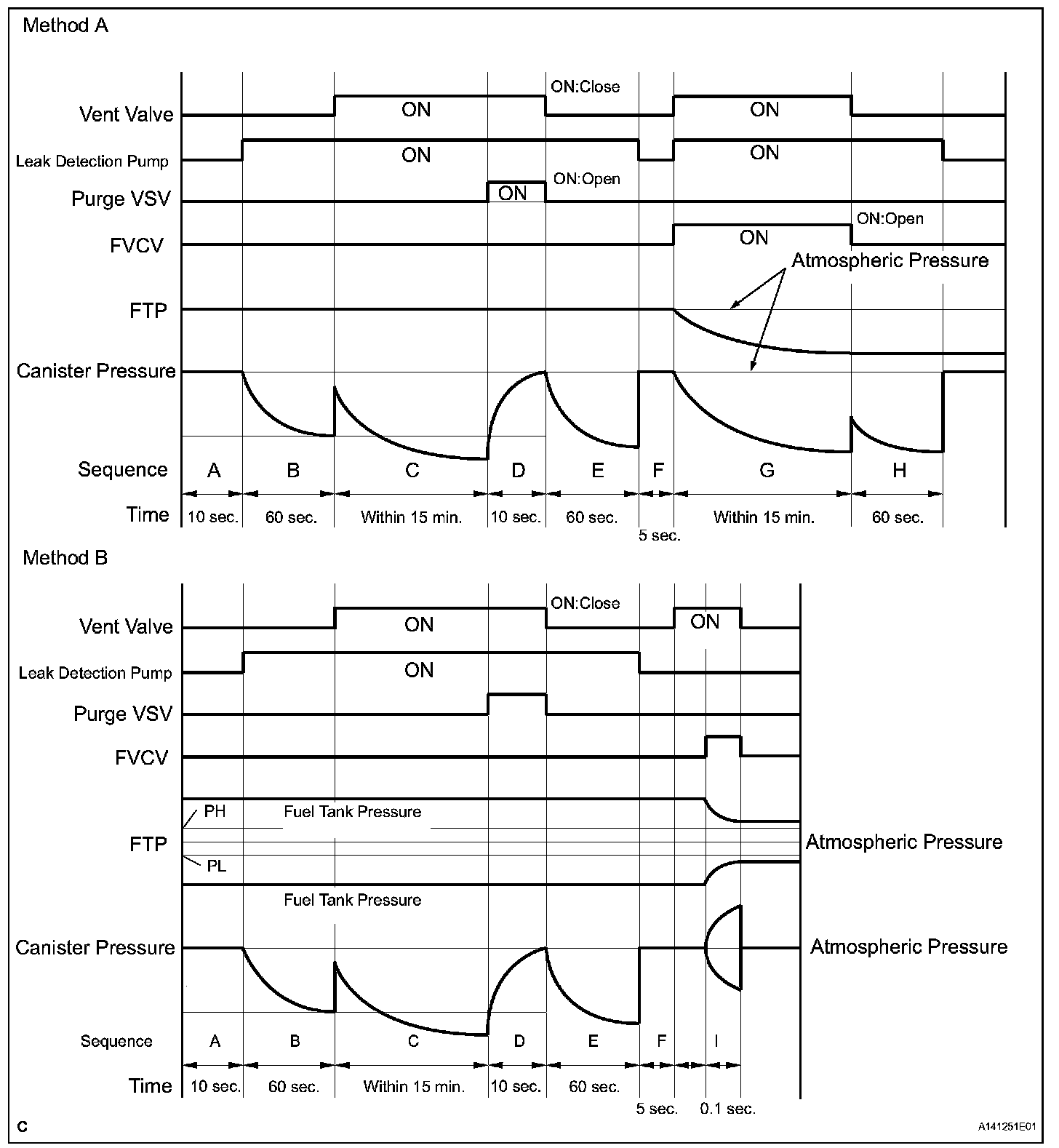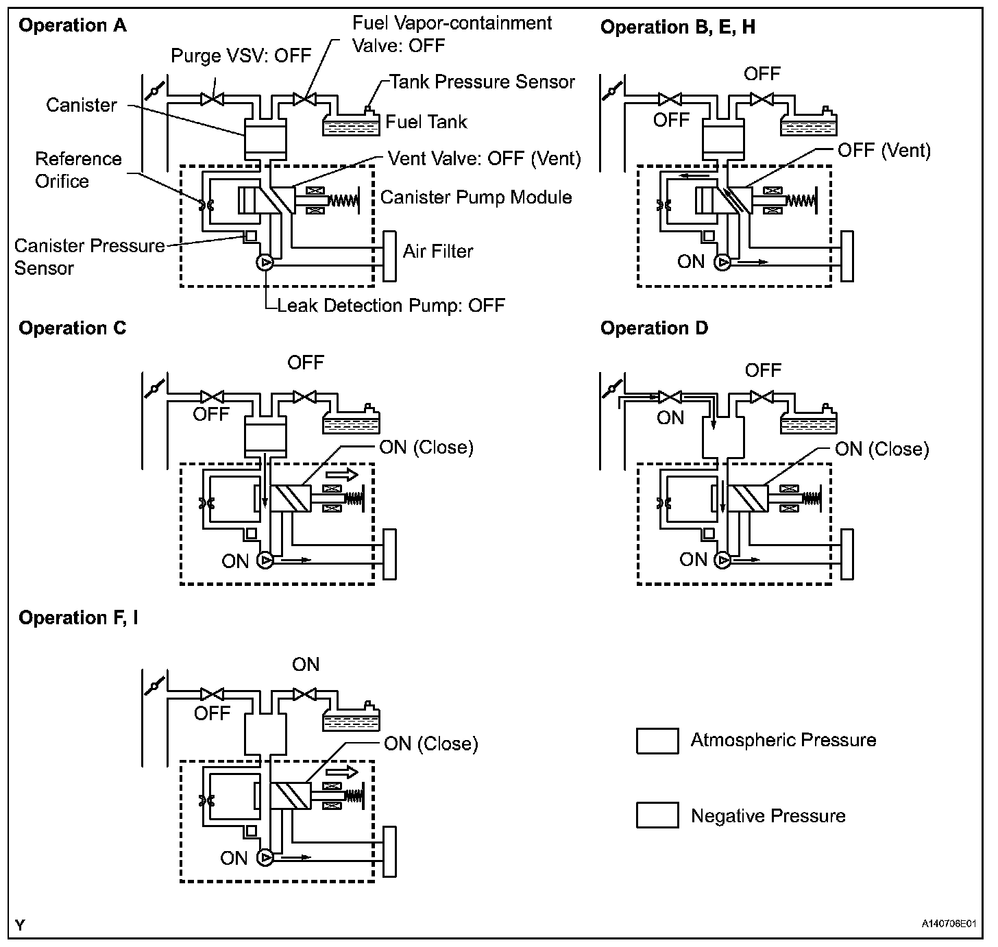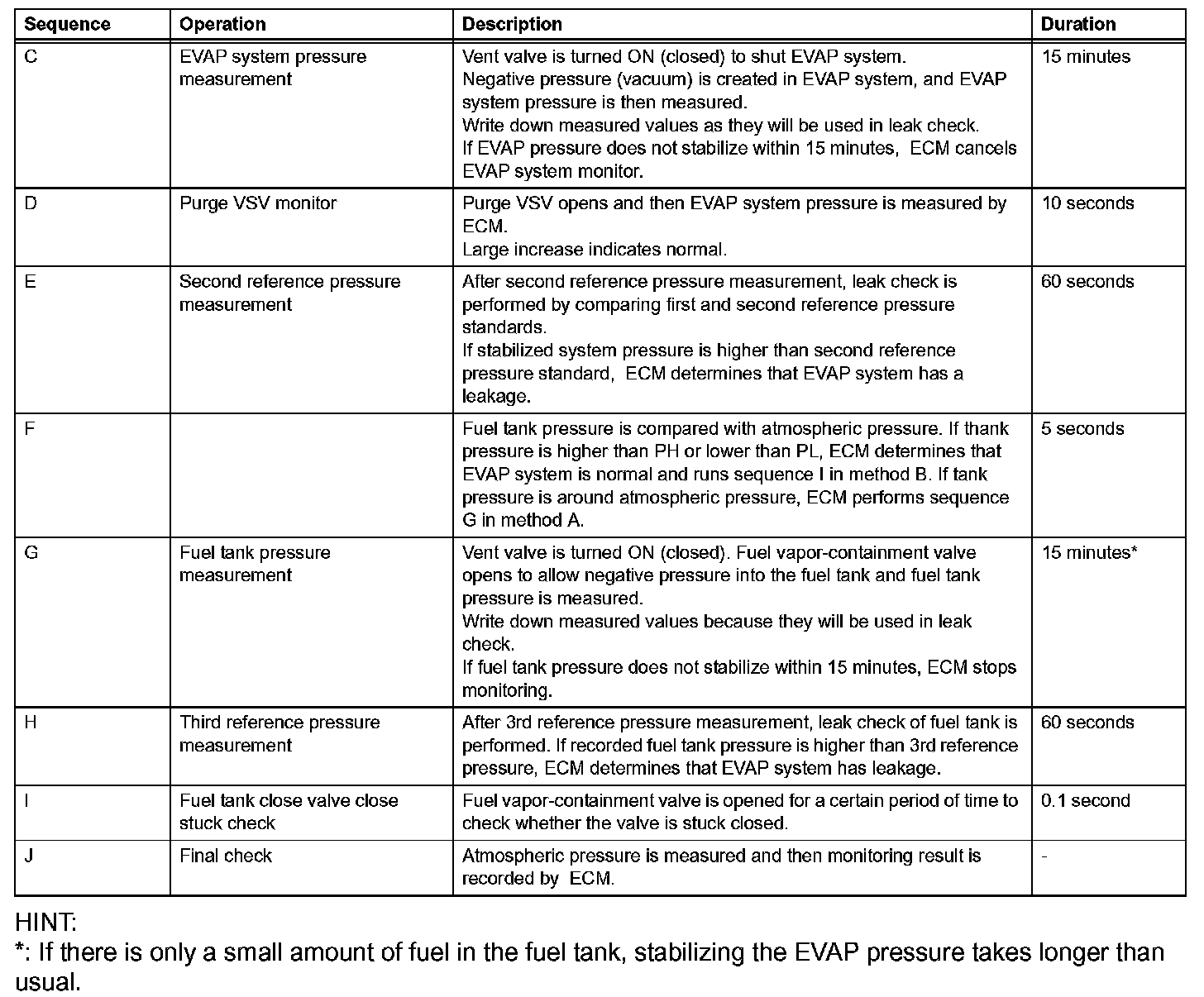 1. If the fuel tank pressure is higher or lower than the atmospheric pressure, the system determines that there are no leaks in the closed tank system and the system will check for leaks from the piping and canister between the purge VSV and canister pump module. (Method A)
